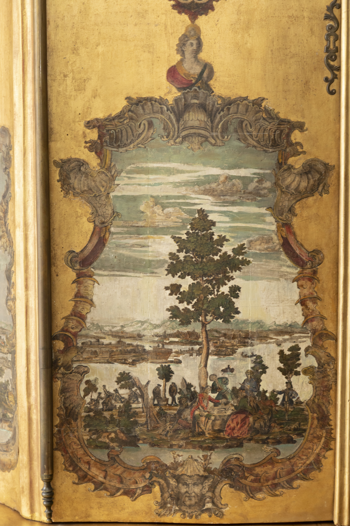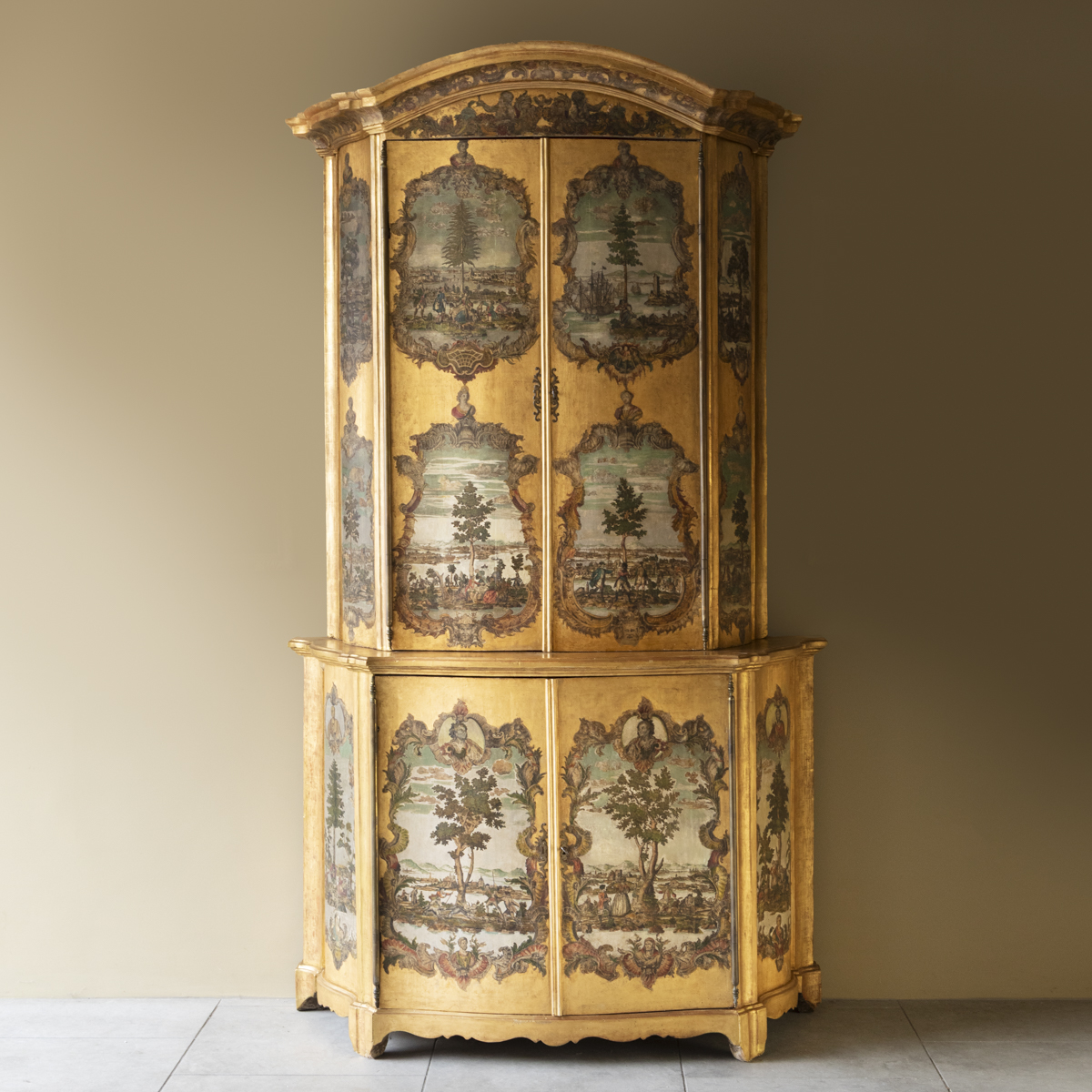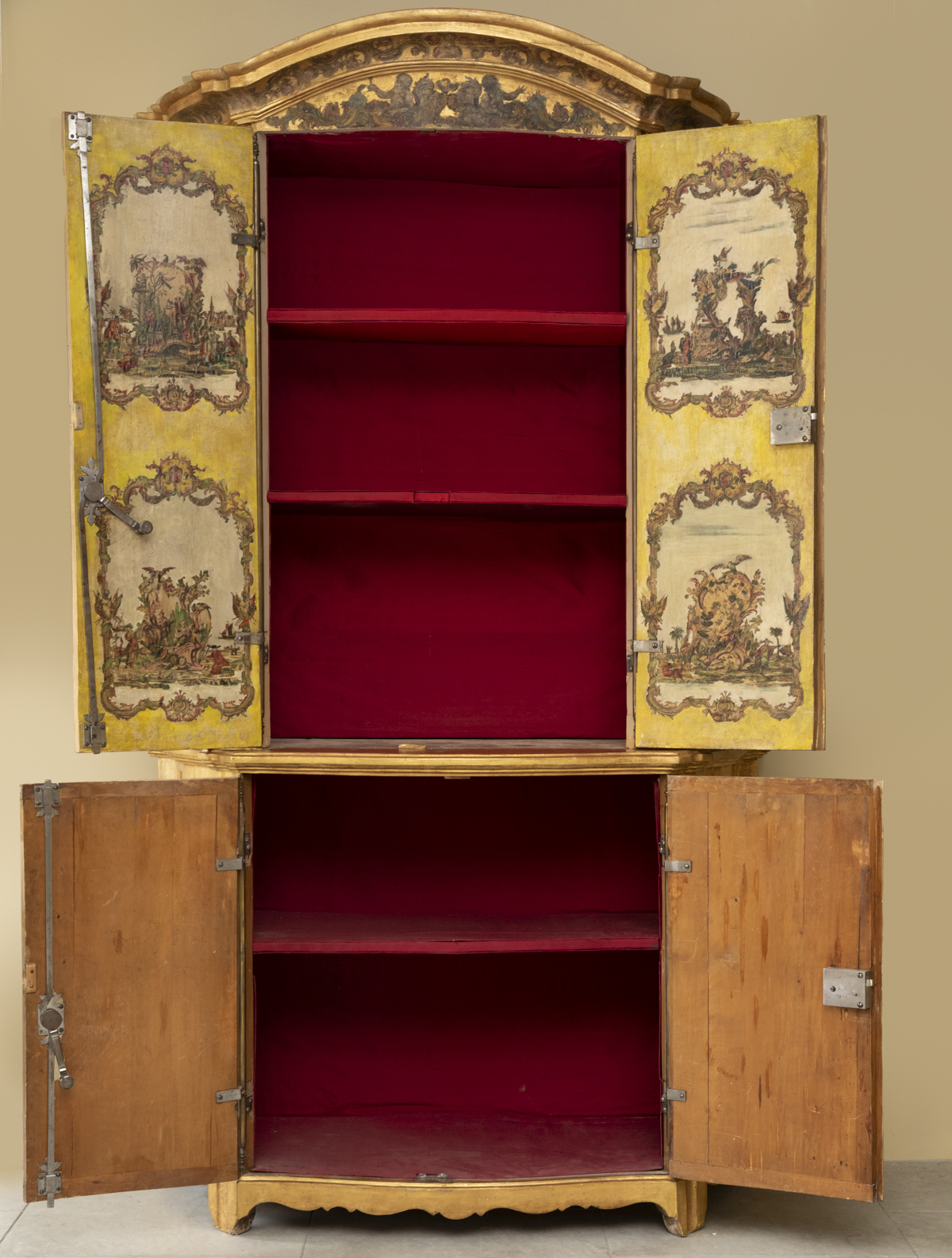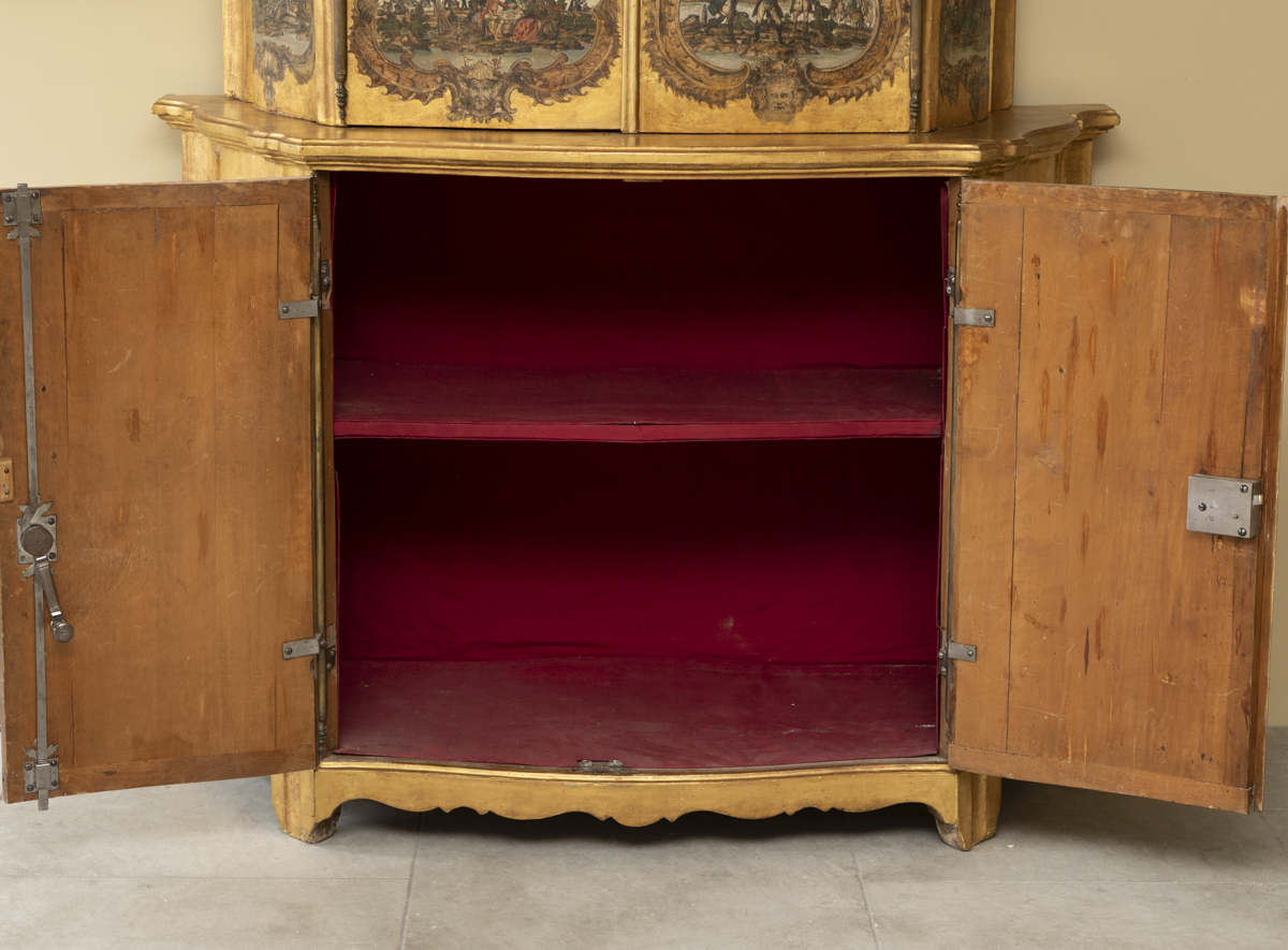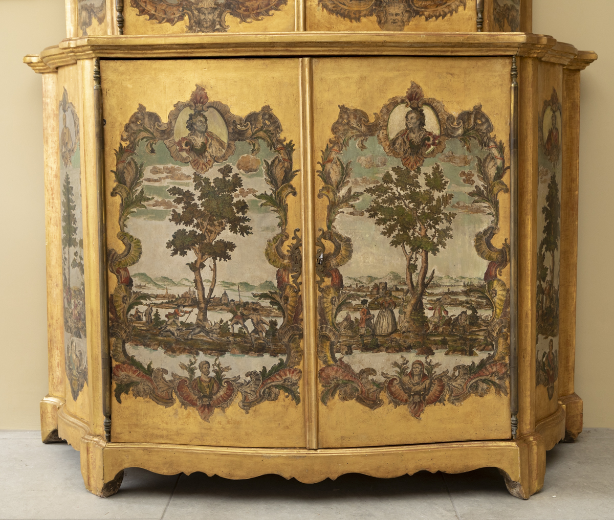 Buffet in two parts with an arched pediment and four doors. The gold leaf ground decorated with twelve large cartouches with rococo cut out engravings depicting pastoral and maritime scenes against a lagoon backdrop surmounted by busts in rocaille style frames. The doors open to reveal pine shelves covered in red silk, and the inside doors of the top part of the buffet bare further decoration in the rococo style.