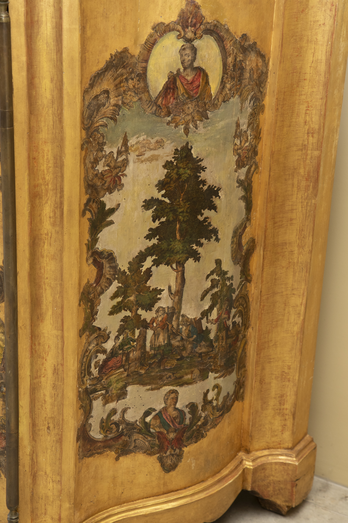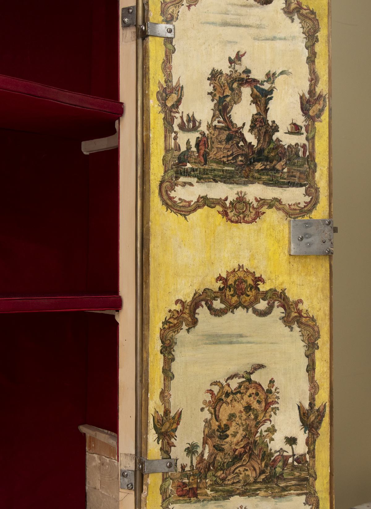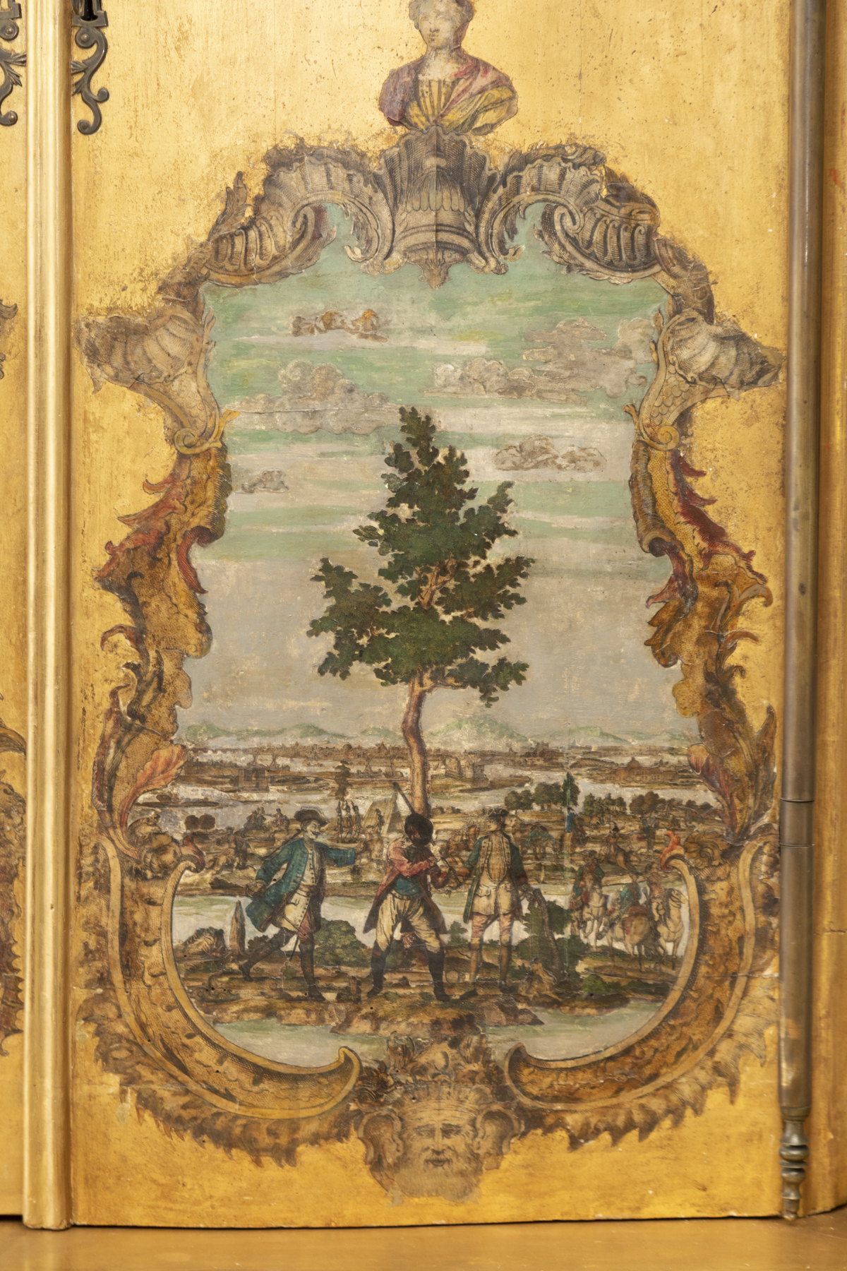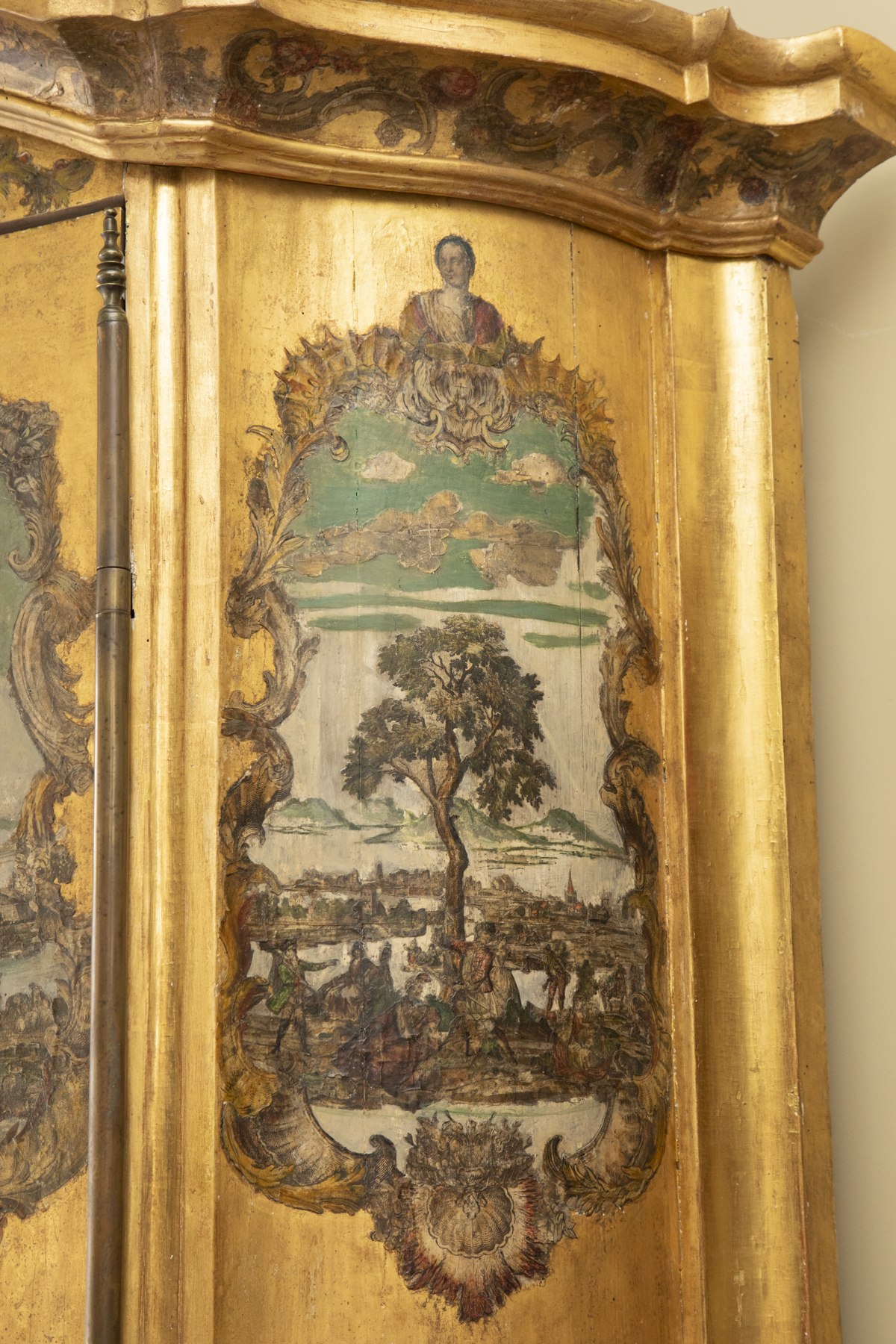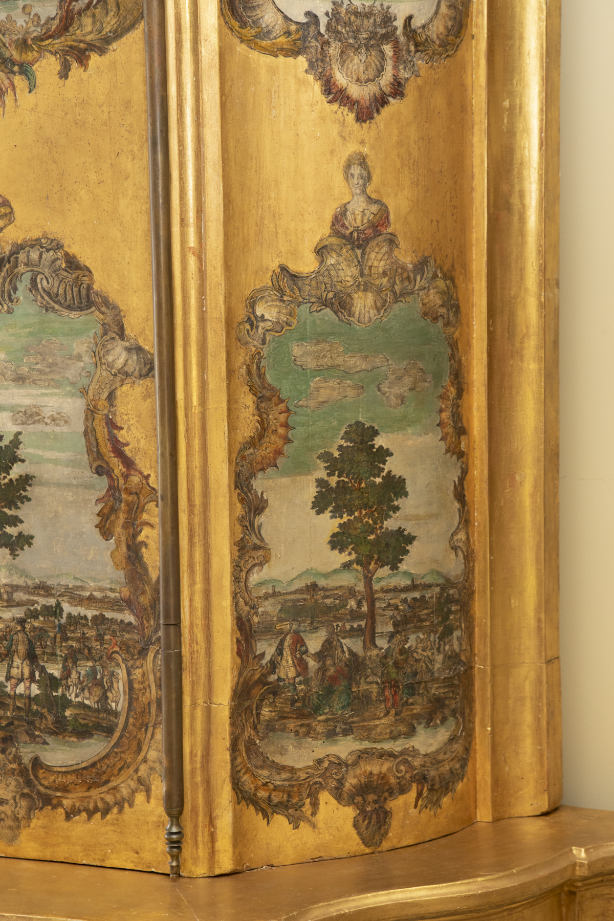 Buffet in two parts with an arched pediment and four doors. The gold leaf ground decorated with twelve large cartouches with rococo cut out engravings depicting pastoral and maritime scenes against a lagoon backdrop surmounted by busts in rocaille style frames. The doors open to reveal pine shelves covered in red silk, and the inside doors of the top part of the buffet bare further decoration in the rococo style.
