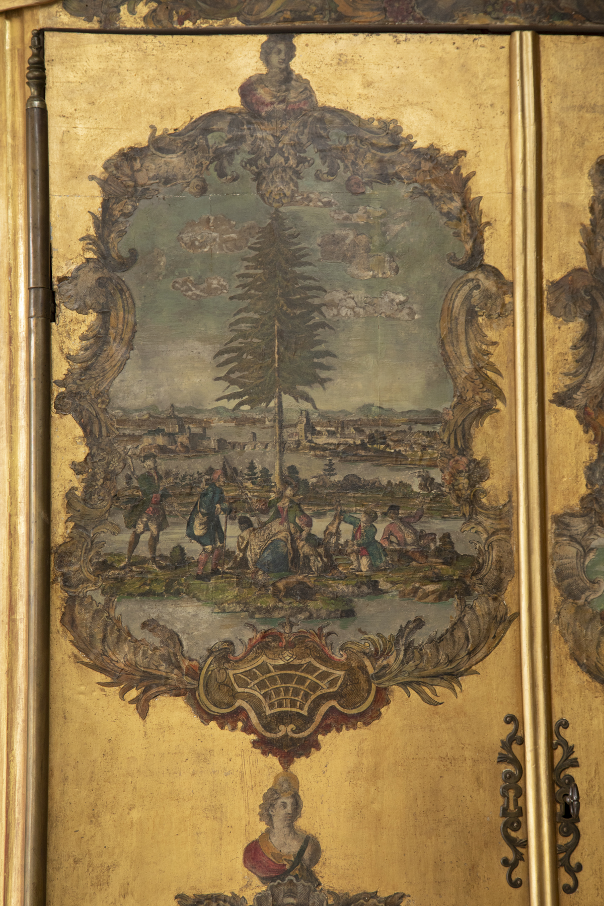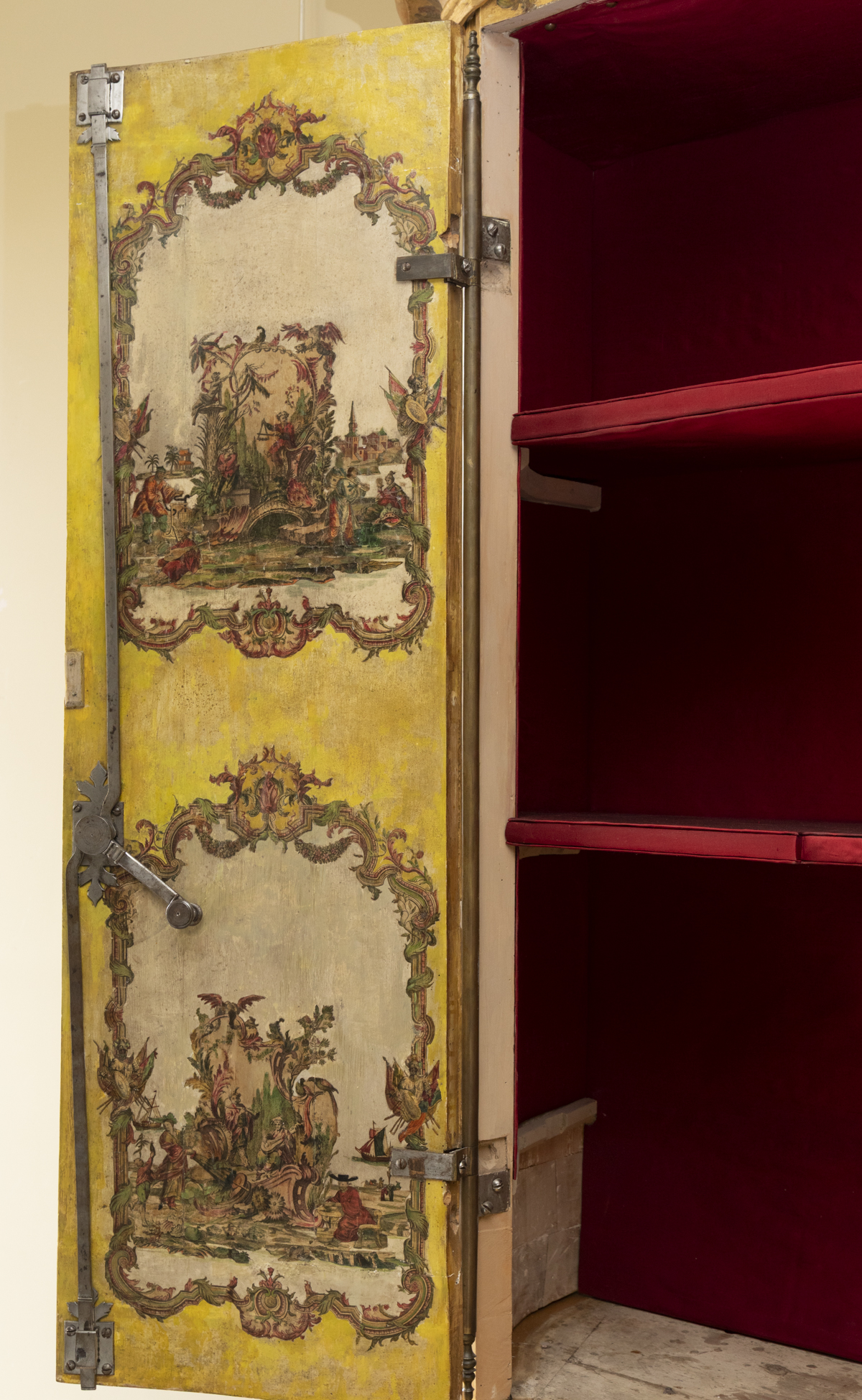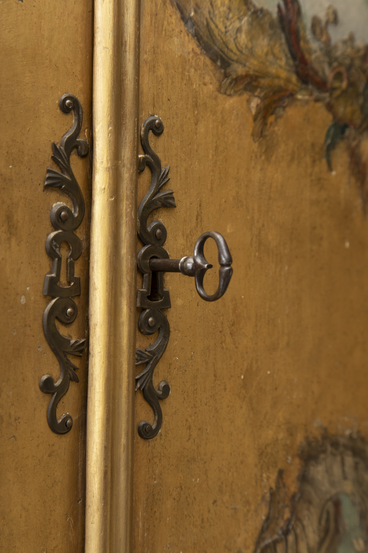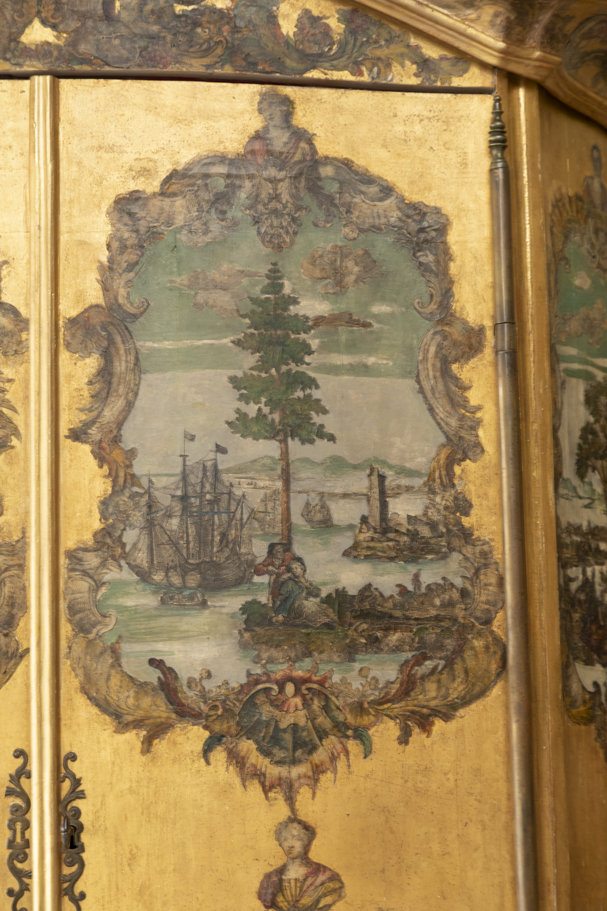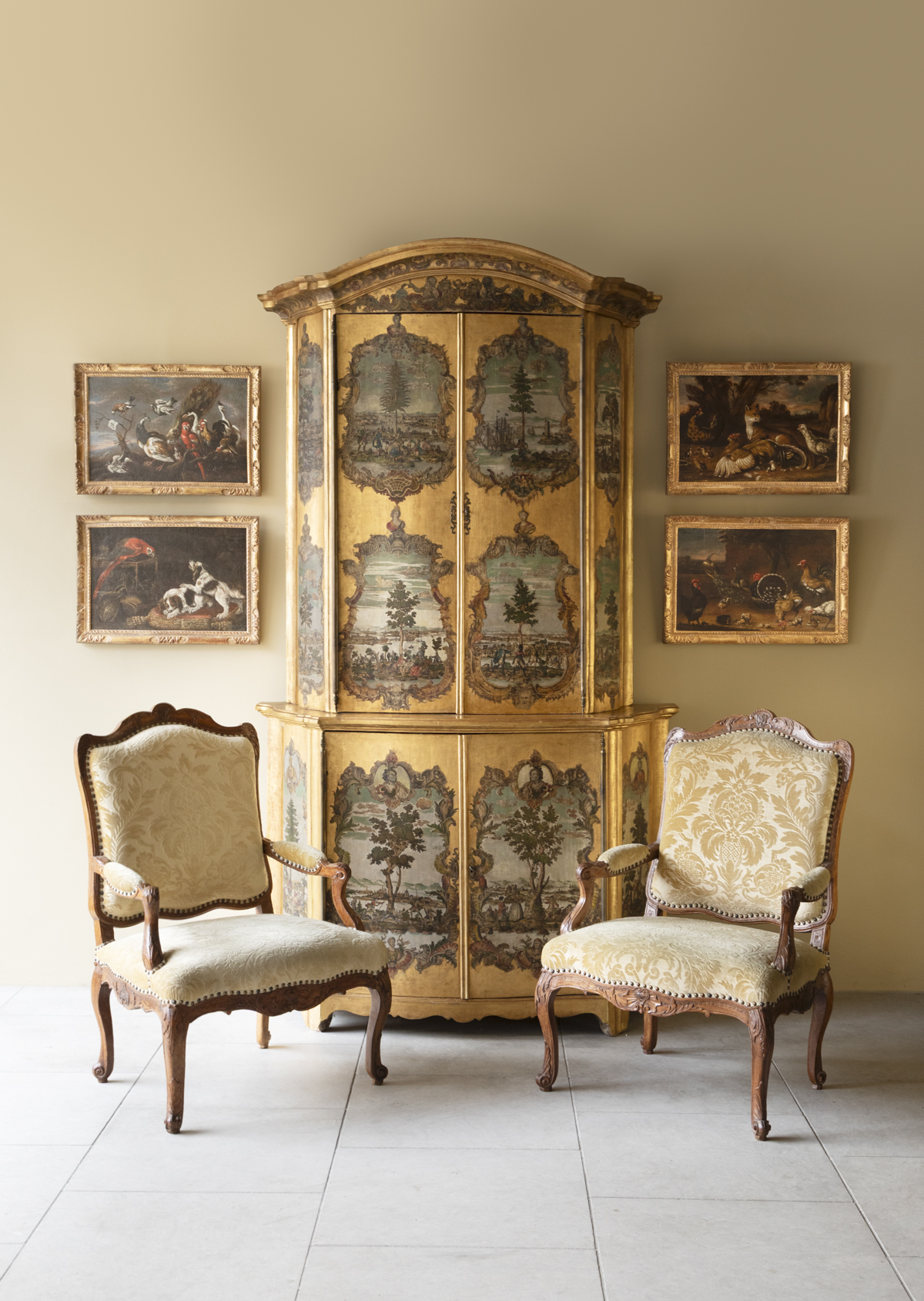 Buffet in two parts with an arched pediment and four doors. The gold leaf ground decorated with twelve large cartouches with rococo cut out engravings depicting pastoral and maritime scenes against a lagoon backdrop surmounted by busts in rocaille style frames. The doors open to reveal pine shelves covered in red silk, and the inside doors of the top part of the buffet bare further decoration in the rococo style.