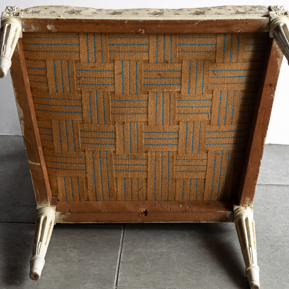 SET OF SIX 18TH CENTURY PAINTED FAUTEUILS Carved beech armchairs with square backs, fluted legs and acanthus decoration on the arms.