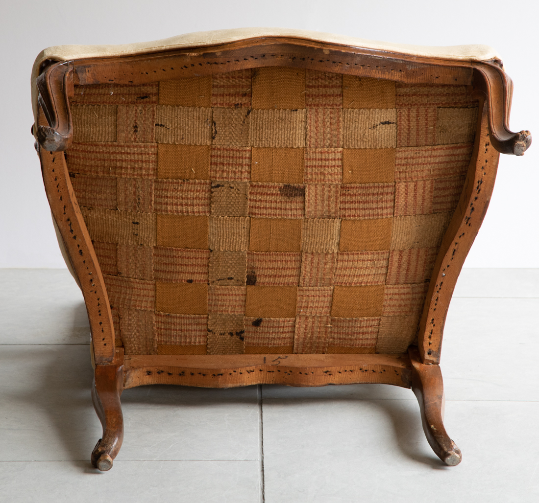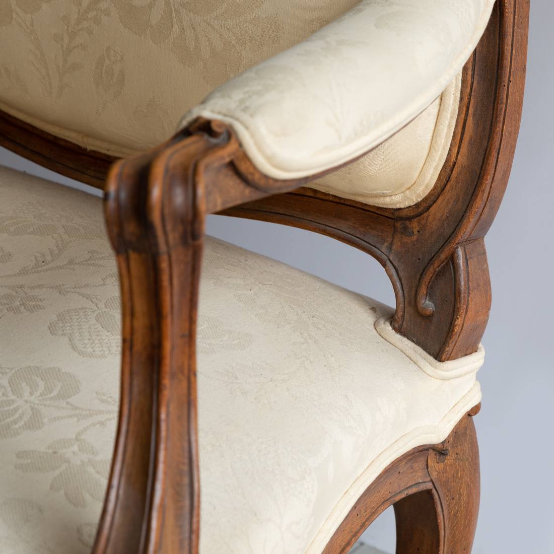 LARGE MID 18TH CENTURY LOUIS XV FAUTEUIL OR OPEN ARM CHAIR With carved scroll decoration to the arms and cabriole legs.
