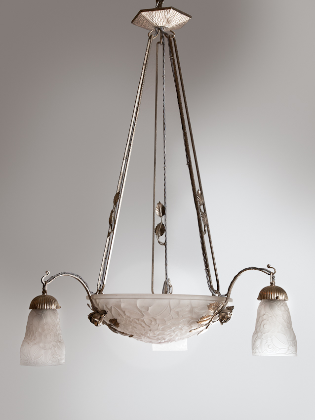 ART DECO THREE-ARM SILVER PLATED AND MOULDED GLASS CHANDELIER- MULLER FRERES