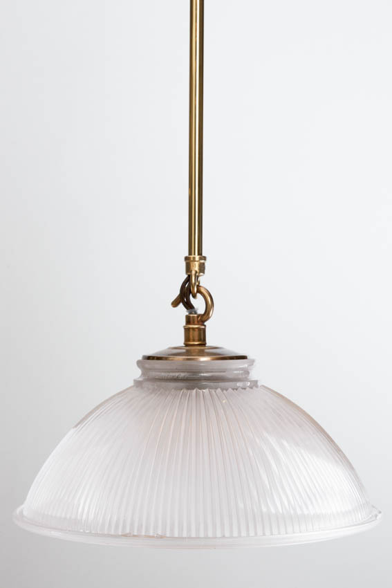 EARLY 20TH ENGLISH HOLOPHANE DISH LIGHT All are stamped with a holophane reference number. Electrified for the UK. Four available in total