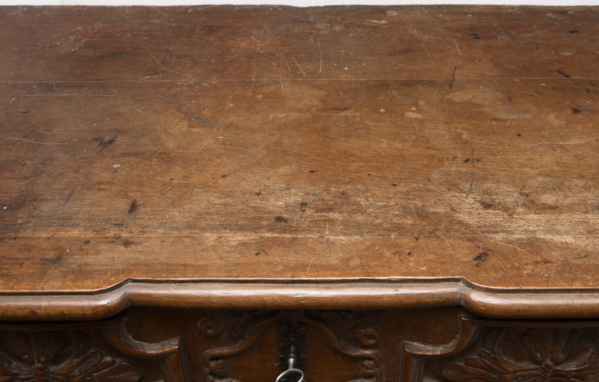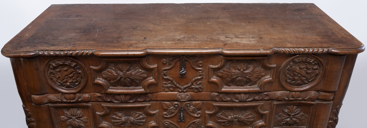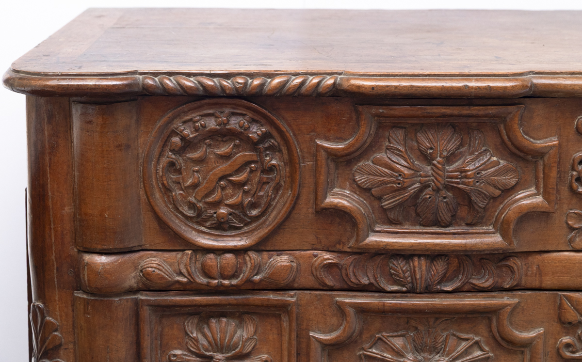 With three long drawers, each divided into five sections with various carvings in relief to include motifs of birds, hearts, flowers, fans, shells and more. The front legs with lighter carving terminating in scrolls, the back legs are square, the sides with a square carved frame. Shaped wooden top with a carved bullnose edge.