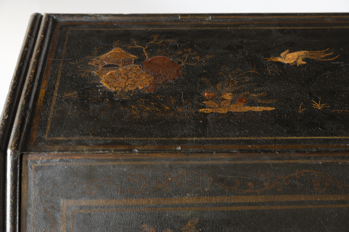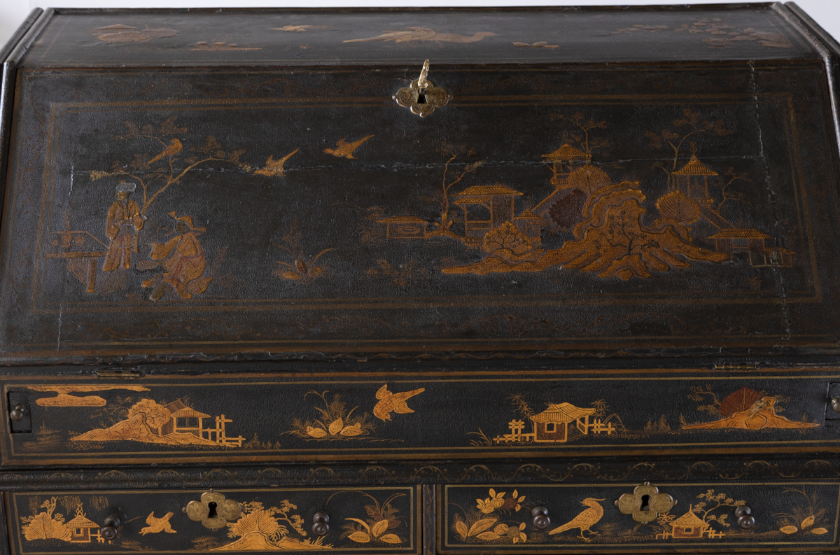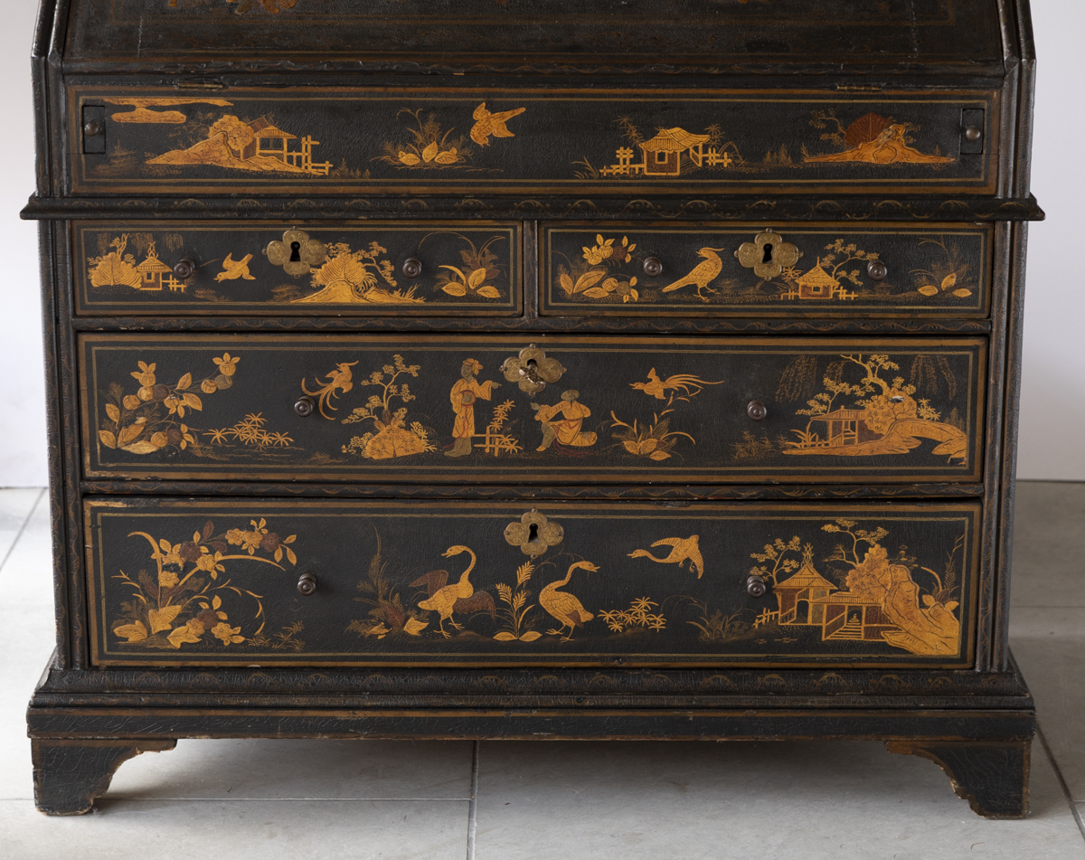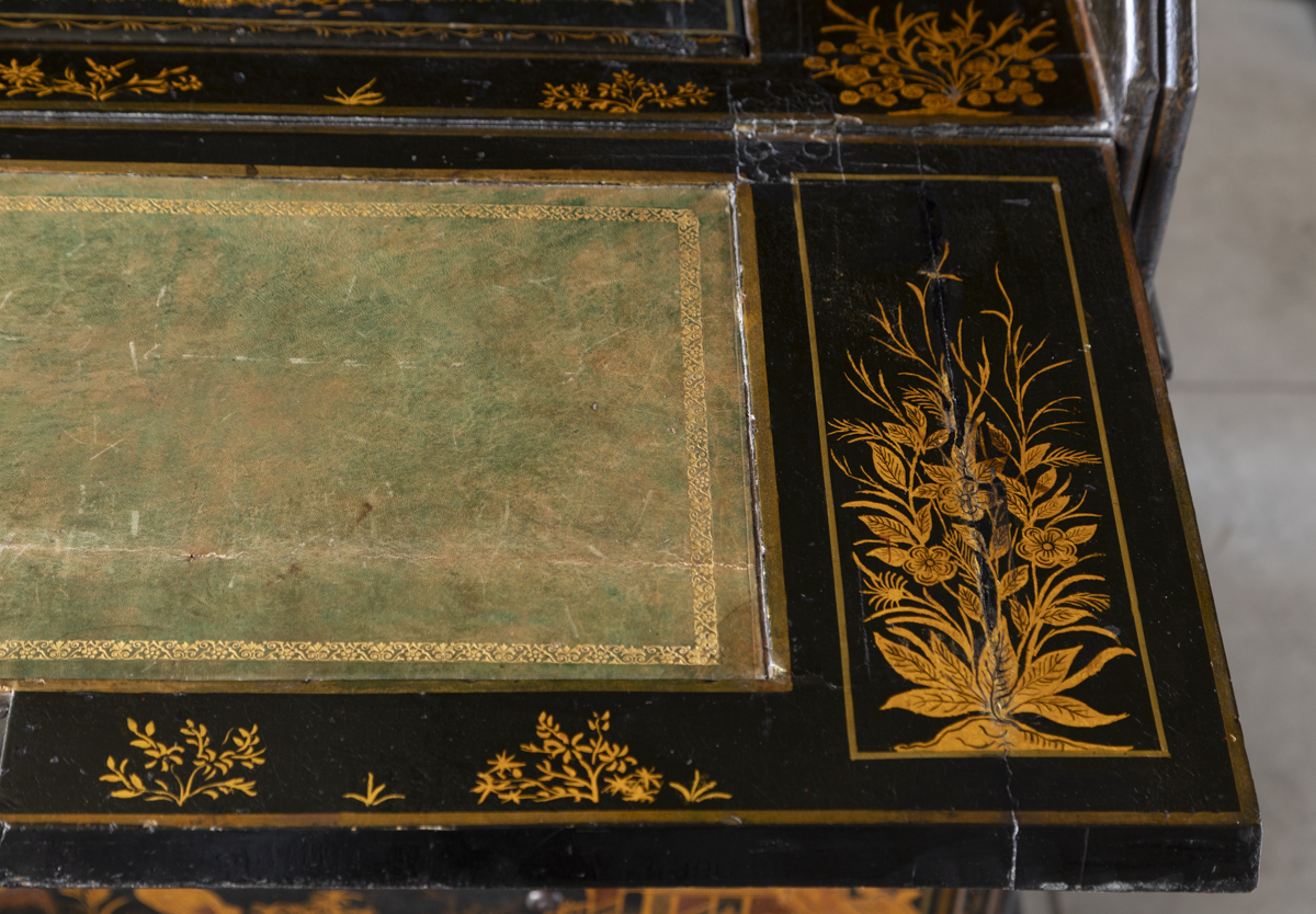 Decorated in gold against a black ground with scenes on all sides imitating 17th century lacquer, depicting birds, figures and gardens in the Japanese style. The fall front enclosing a fitted interior with four variously sized drawers, eight pigeon holes with a central cupboard, two secret drawers and a sliding well. Green leather writing top with gold tooled edge.