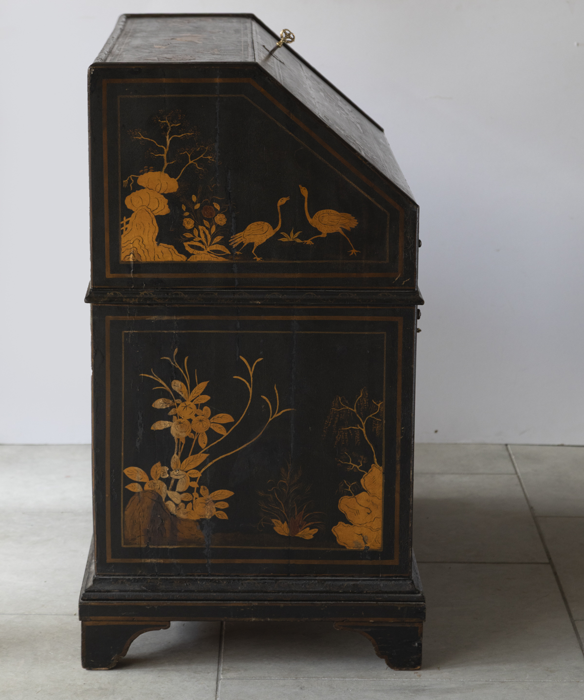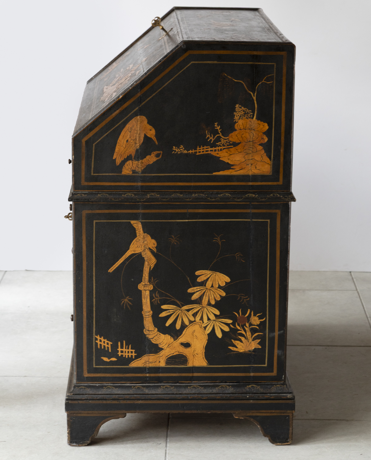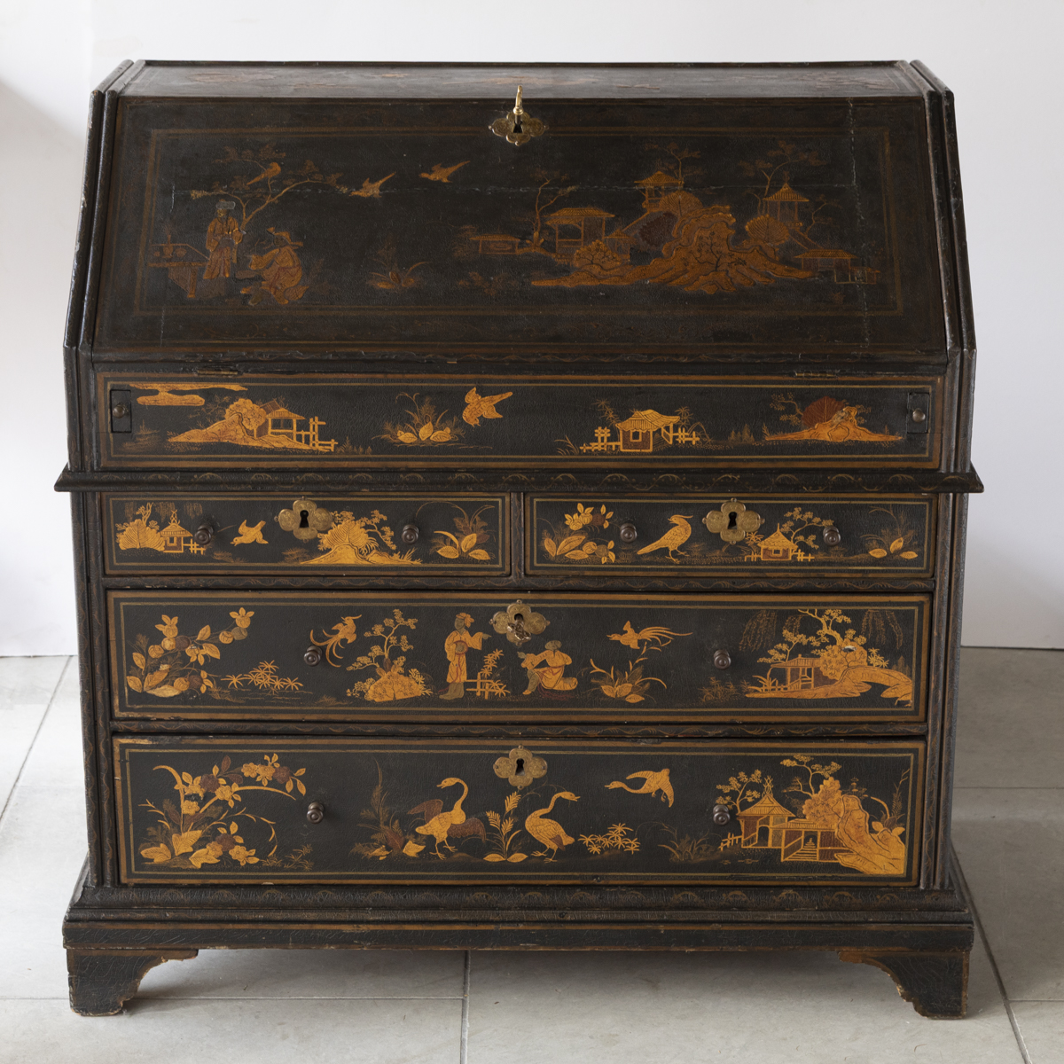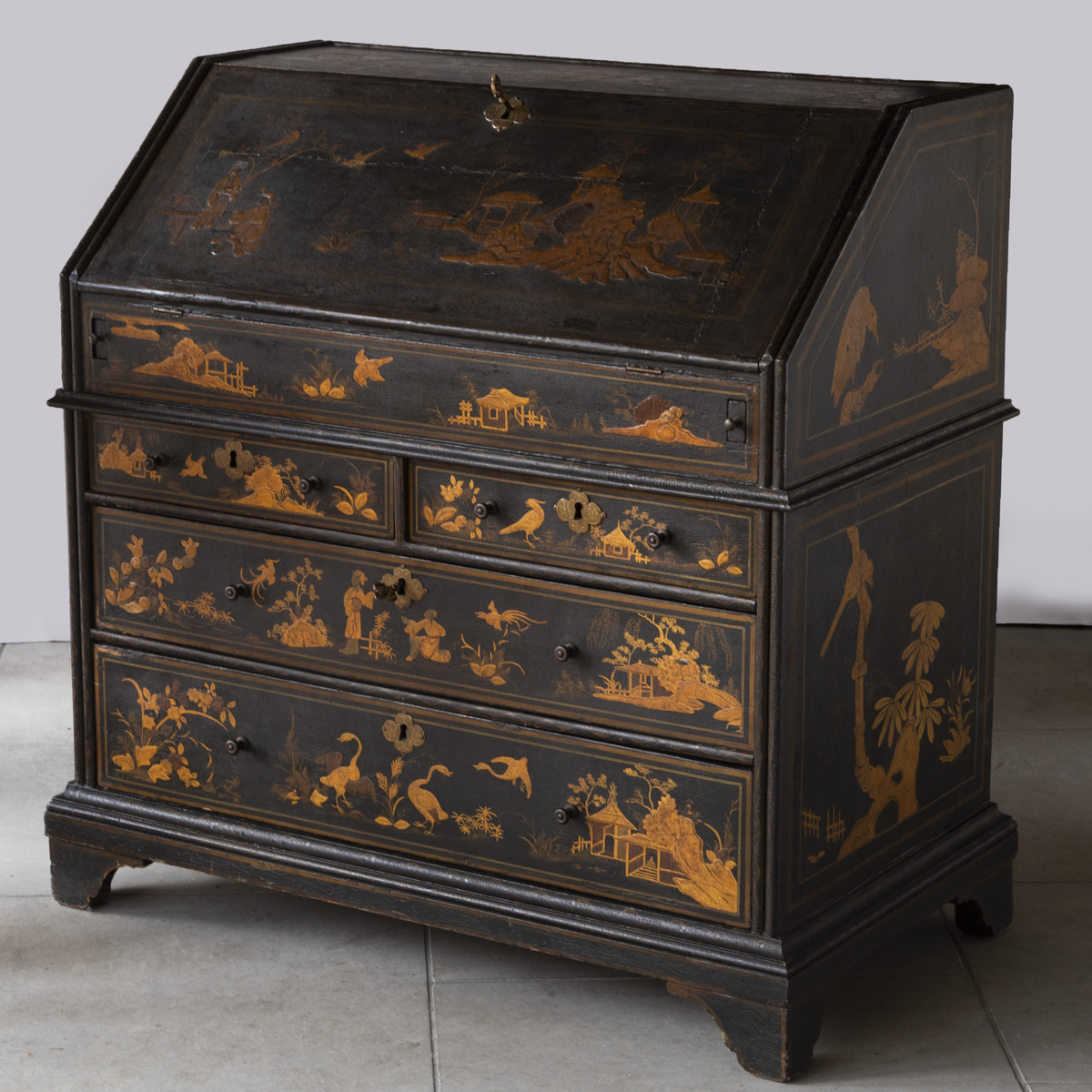 Decorated in gold against a black ground with scenes on all sides imitating 17th century lacquer, depicting birds, figures and gardens in the Japanese style. The fall front enclosing a fitted interior with four variously sized drawers, eight pigeon holes with a central cupboard, two secret drawers and a sliding well. Green leather writing top with gold tooled edge.