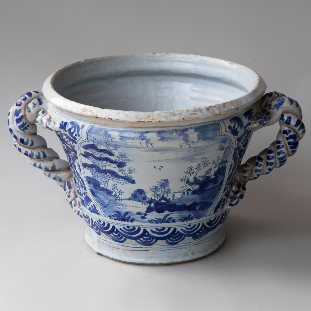 The circular tapered body with two twisted rope handles depicting a Chinese garden setting with plants and trees painted in blue on a pale blue glazed white background. Three drilled holes in the base. France late 17th century, circa 1680.