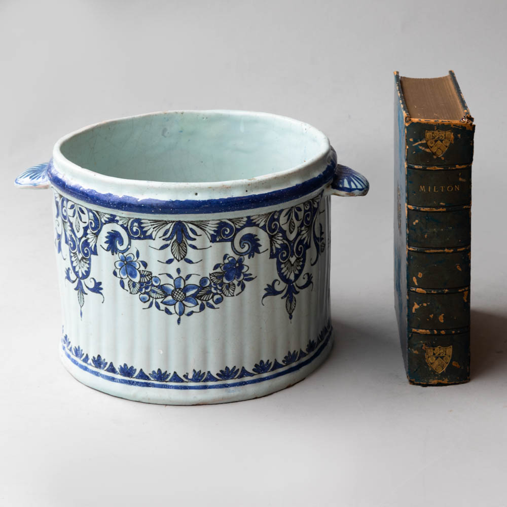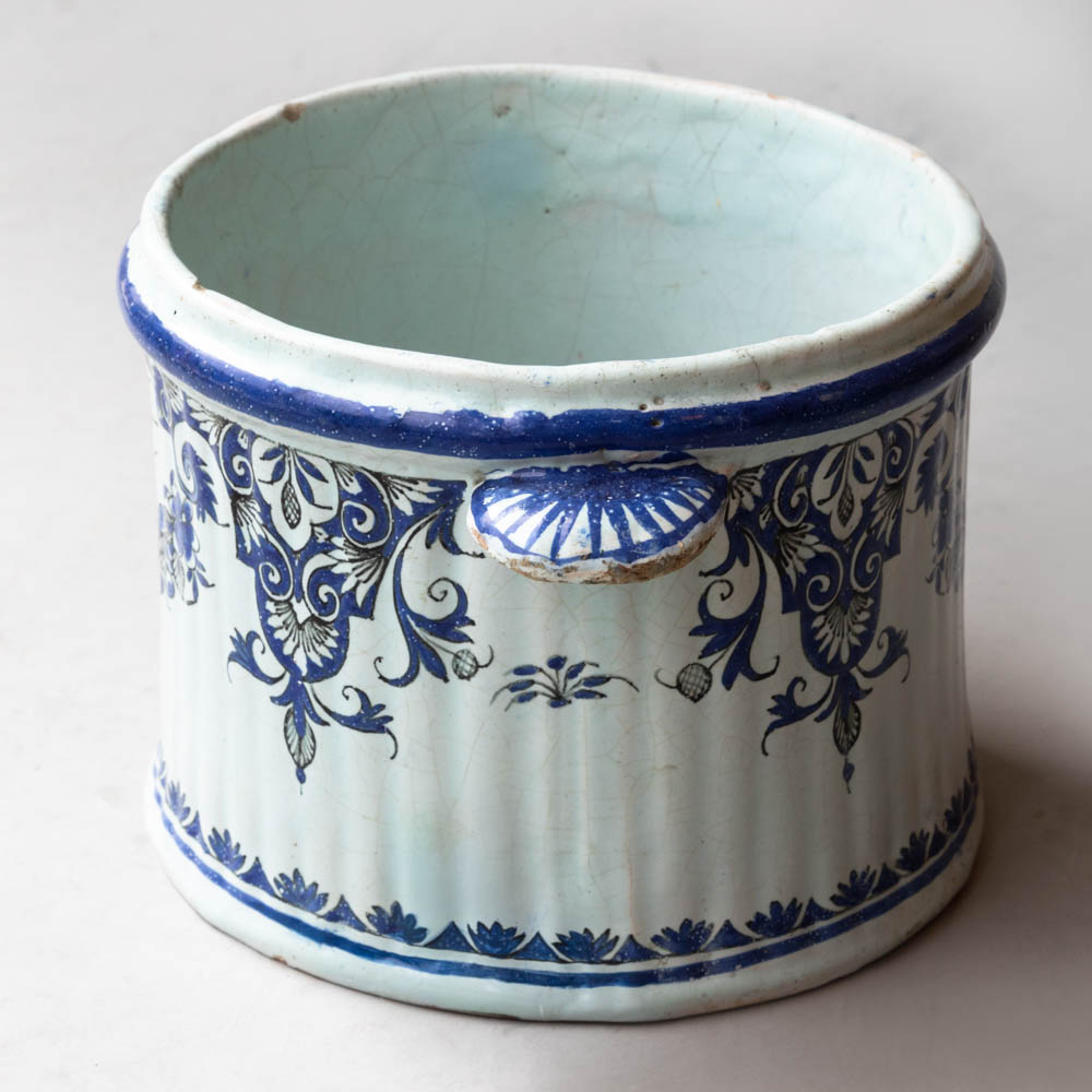 Of cylindrical reeded shape with shell handles on either side. Encircled top and base with a blue line.