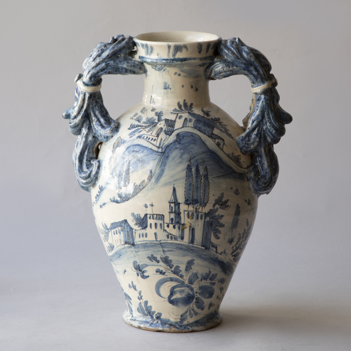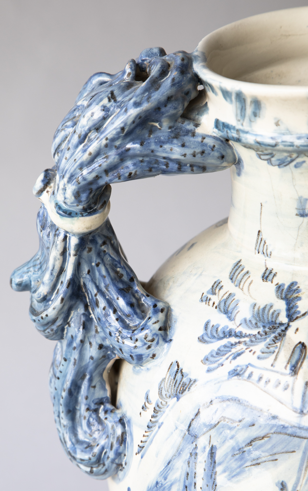 17th century baluster vase, cobalt blue on a white ground, with two handles in the form of acanthus leaves.