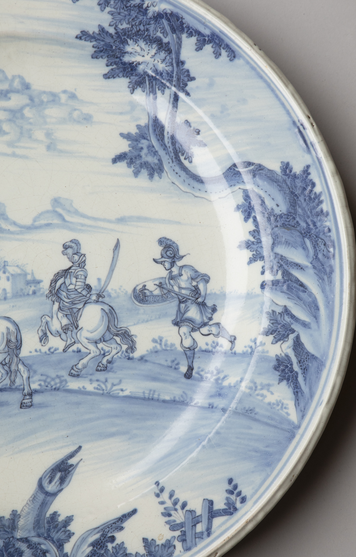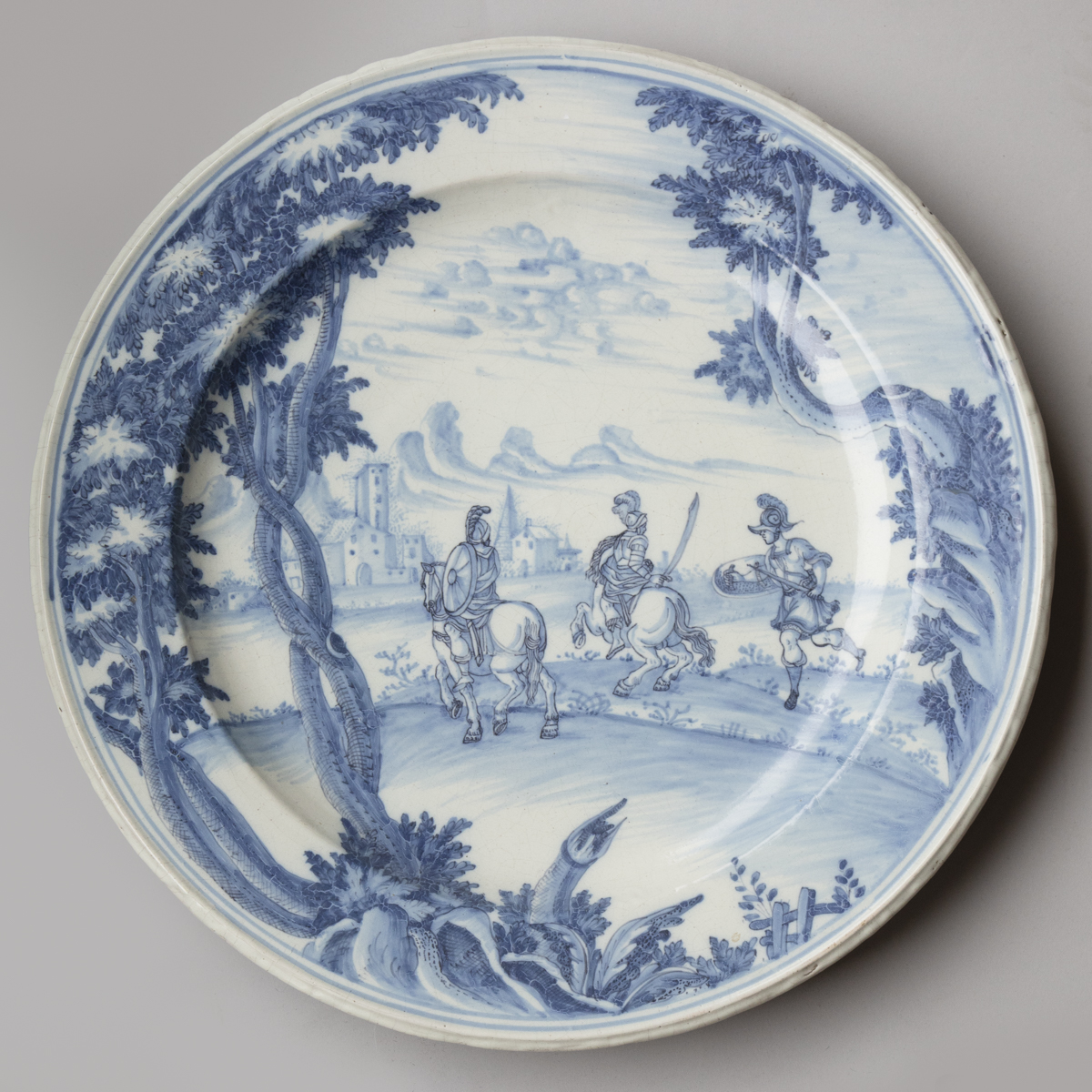 Painted in cobalt blue on a white ground, with a landscape image depicting three soldier, two of whom are on horseback in Roman costume with swords and shields approaching a village in the distance and with trees in the foreground.