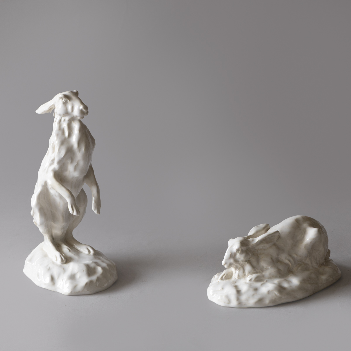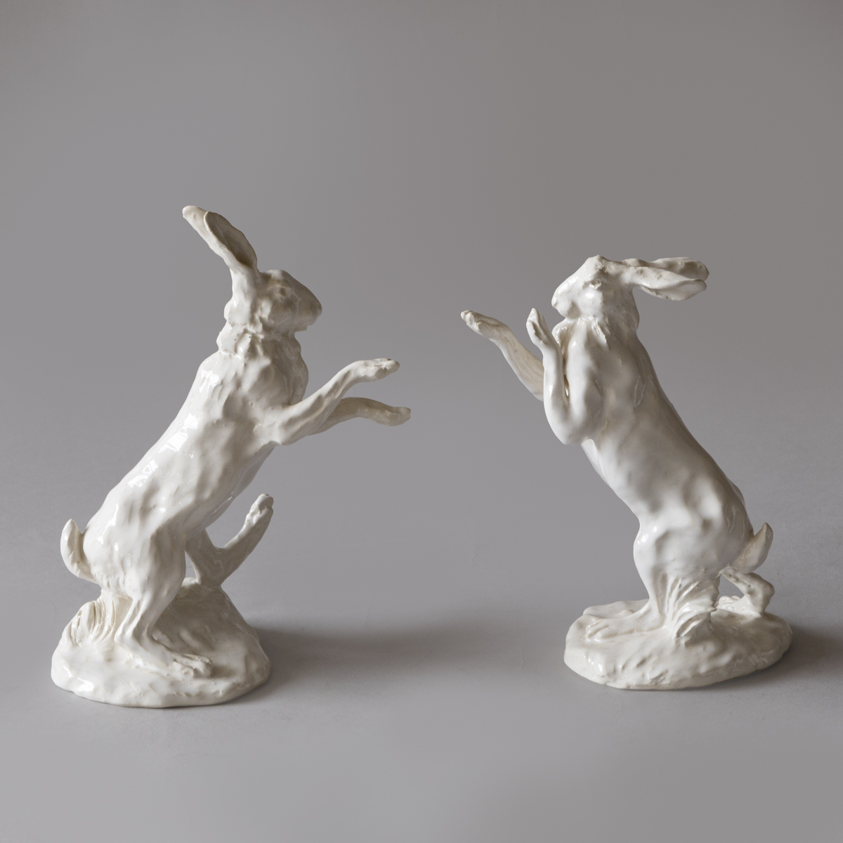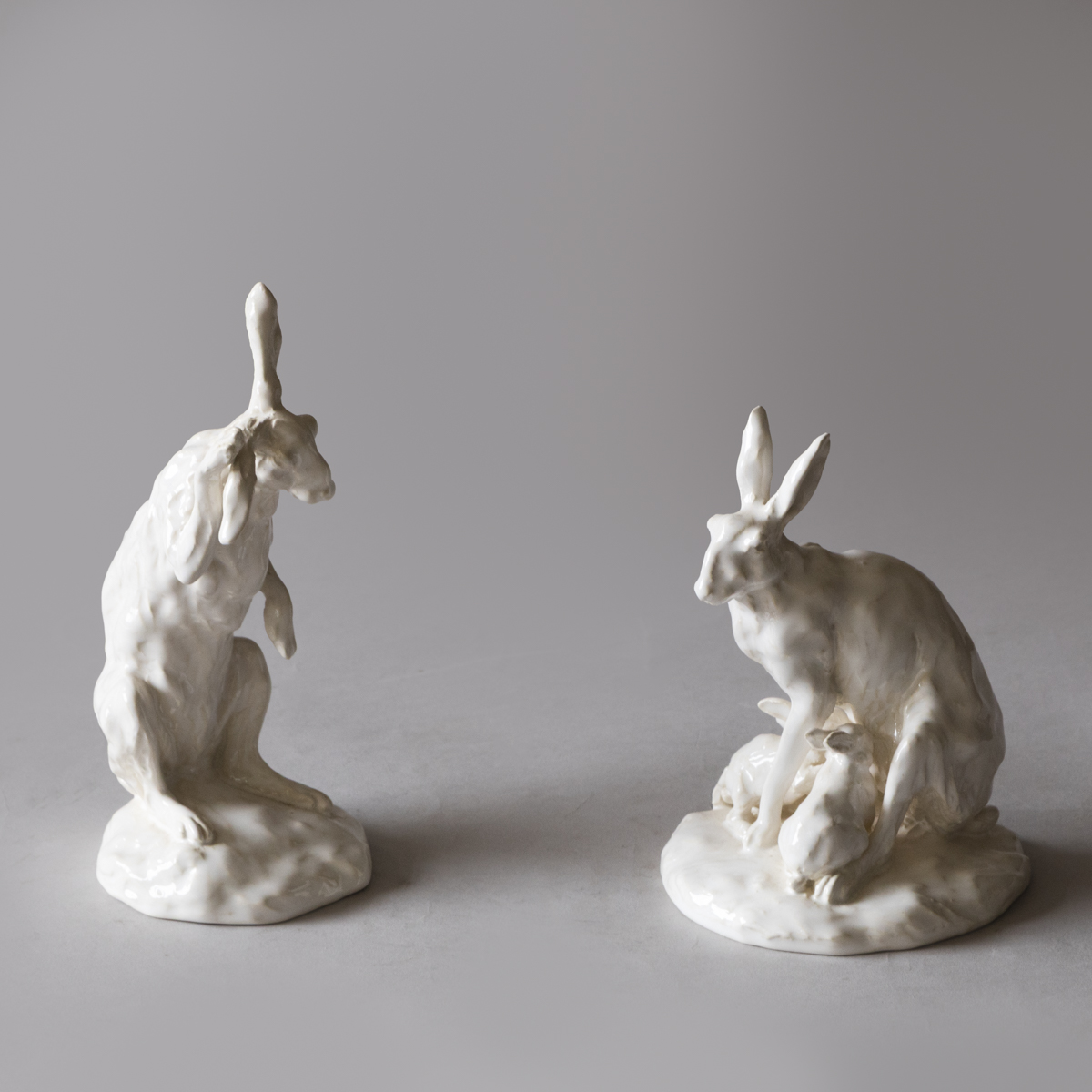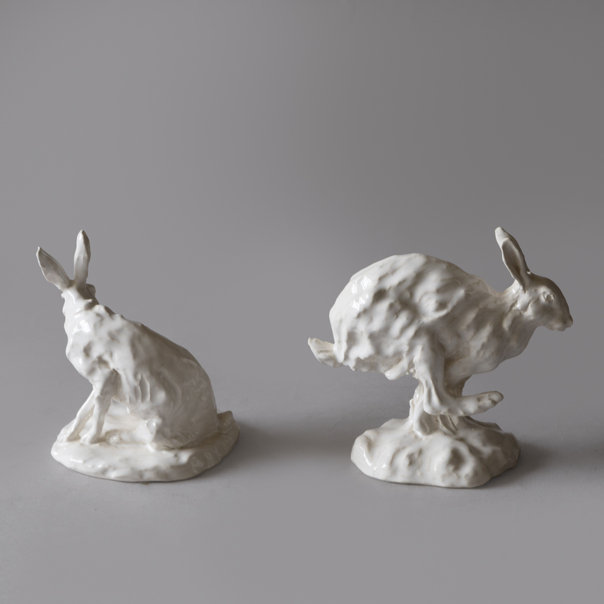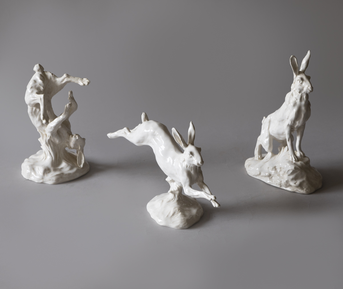 A collection of fifteen sculptures depicting hares in various lifelike positions; standing, sleeping, boxing etc.