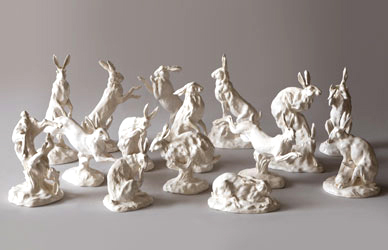 A COLLECTION OF 15 SMALL HARE SCULPTURES IN VARIOUS POSITIONS |