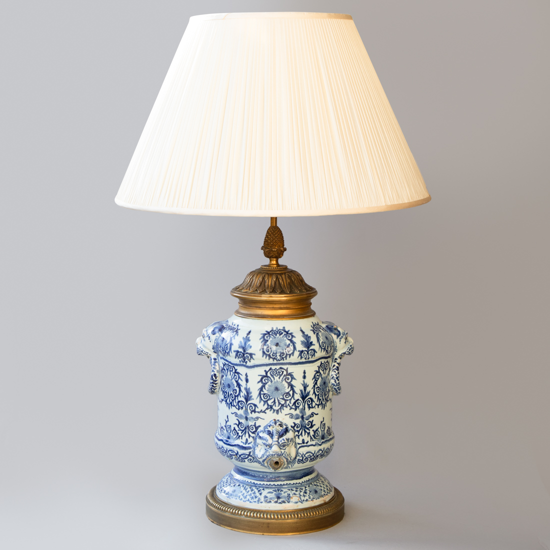 Faience baluster fountain raised on a pied douche with mask handles in the form of lion's heads holding rings.