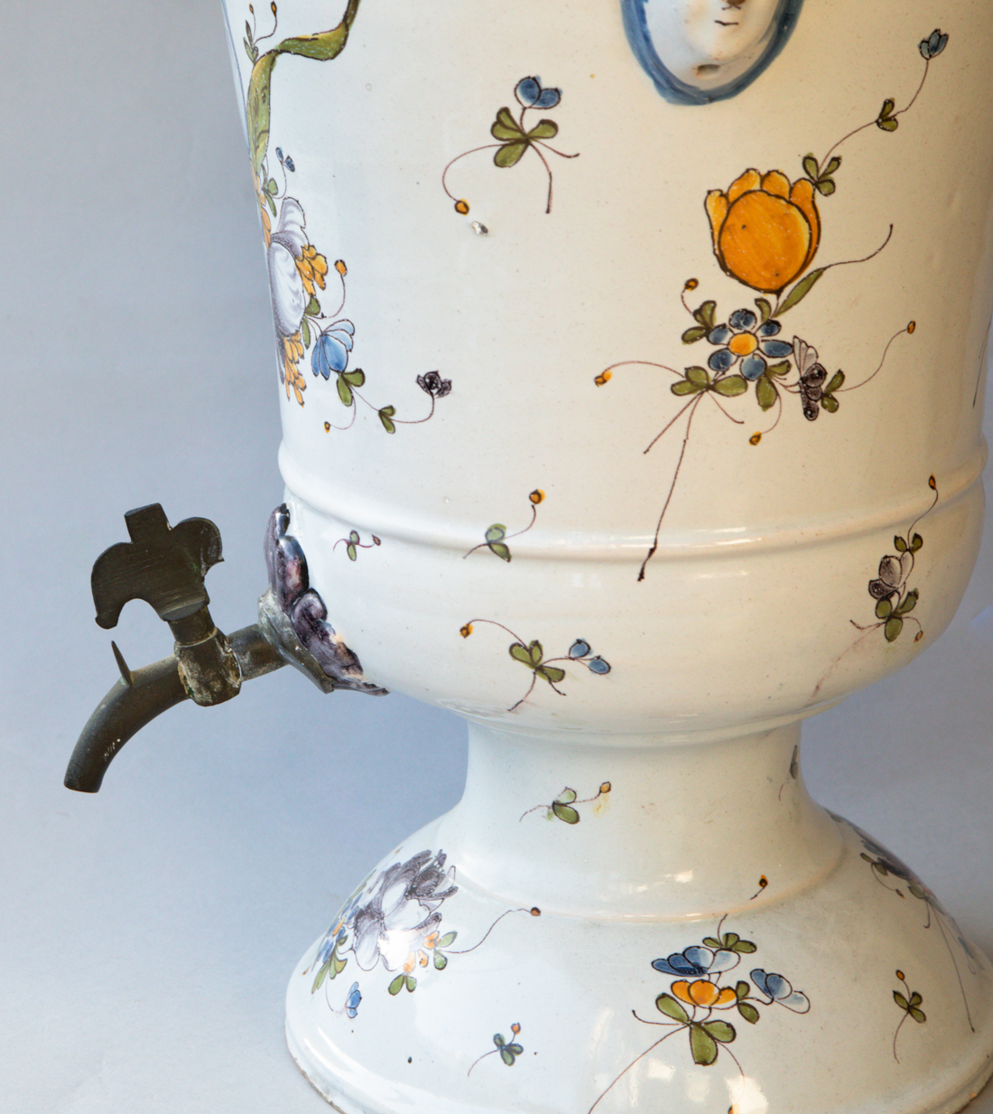 Decorated in green, yellow and blue on a white ground with posies of flowers and leaves, with original bronze tap.