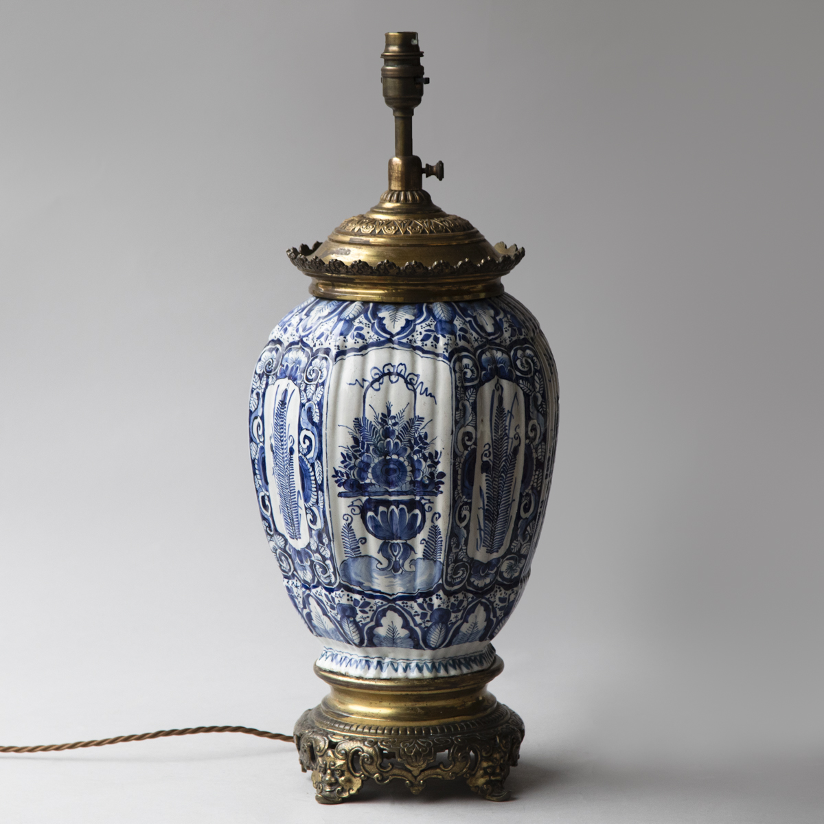 Mounted with later gilt brass French mounts with masks on the base, and converted to electricity for the UK.