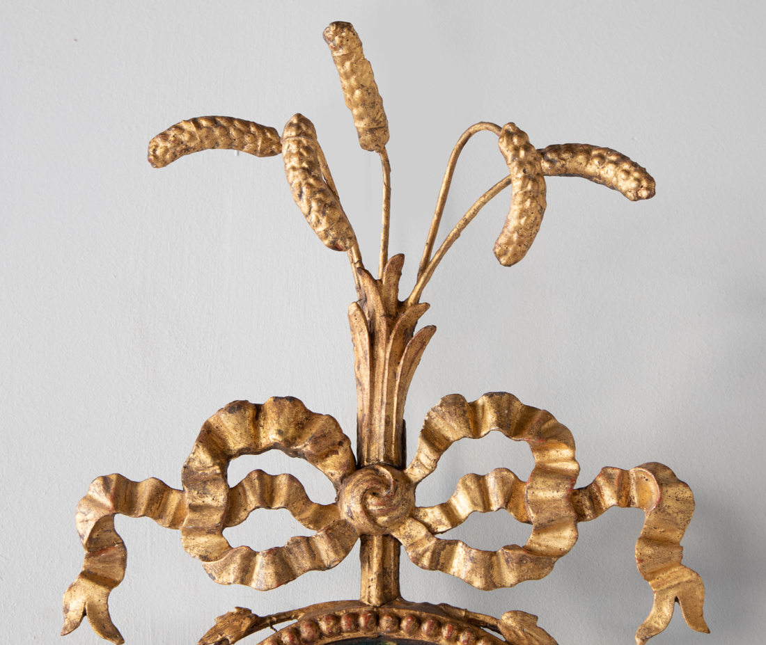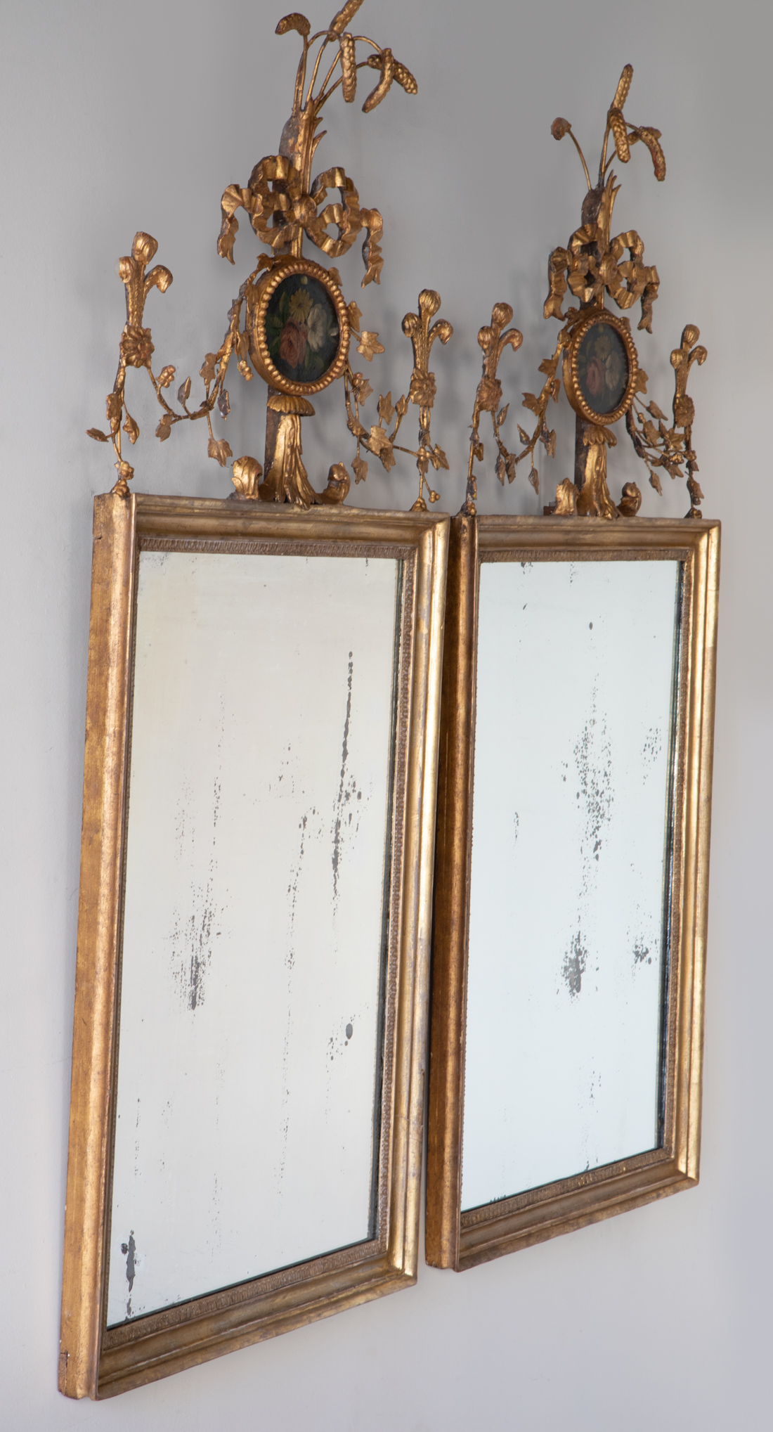 LATE 18TH CENTURY The rectangular plates with leaf and berry frames surmounted by a central small oval still life painting of three flowers, crowned by a ribboned bow holding a sheaf of corn. Surrounding this a finely carved garland of ivy which supports a rosette and plume of ostrich feathers at the corner of both the top right and left hand corners of the mirror.