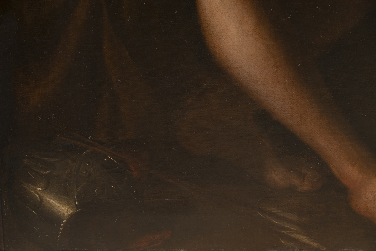 blacksmith to the gods, with Venus' son Cupid holding a quiver full of arrows with a bow on the ground in front of him. Vulcan holds a hammer and tongs, the tools of his trade with armour at his feet, possibly meant for Venus' mortal son Aeneas to fight with in the wars against the Rutuli, written of in Virgil's epic poem the Aeneid.