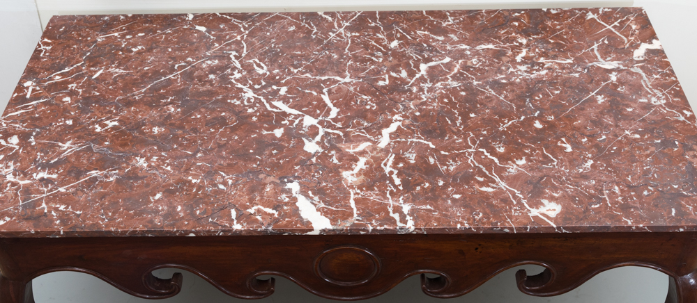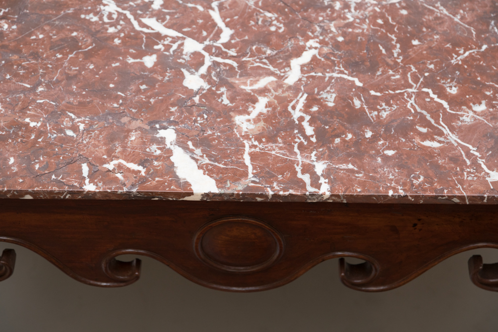 The front and sides have a deeply shaped apron with a raised carved edge. Replacement Breche marble top.