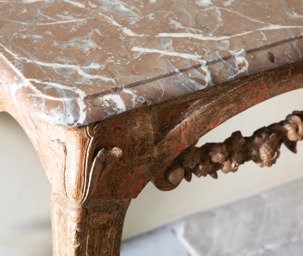 The painted apron with a central foliate carving and two carved swags to either side of this decorated with fruit and flowers.