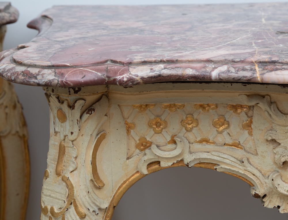 A pair of carved oak frame console tables with cabriole legs terminating in scroll feet. The body of the consoles painted in cream with gilt highlight decoration, the feet with earlier dark green paint. The carving of the apron and shoulders with rococo design. Shaped Fleur de Pêcher marble tops.