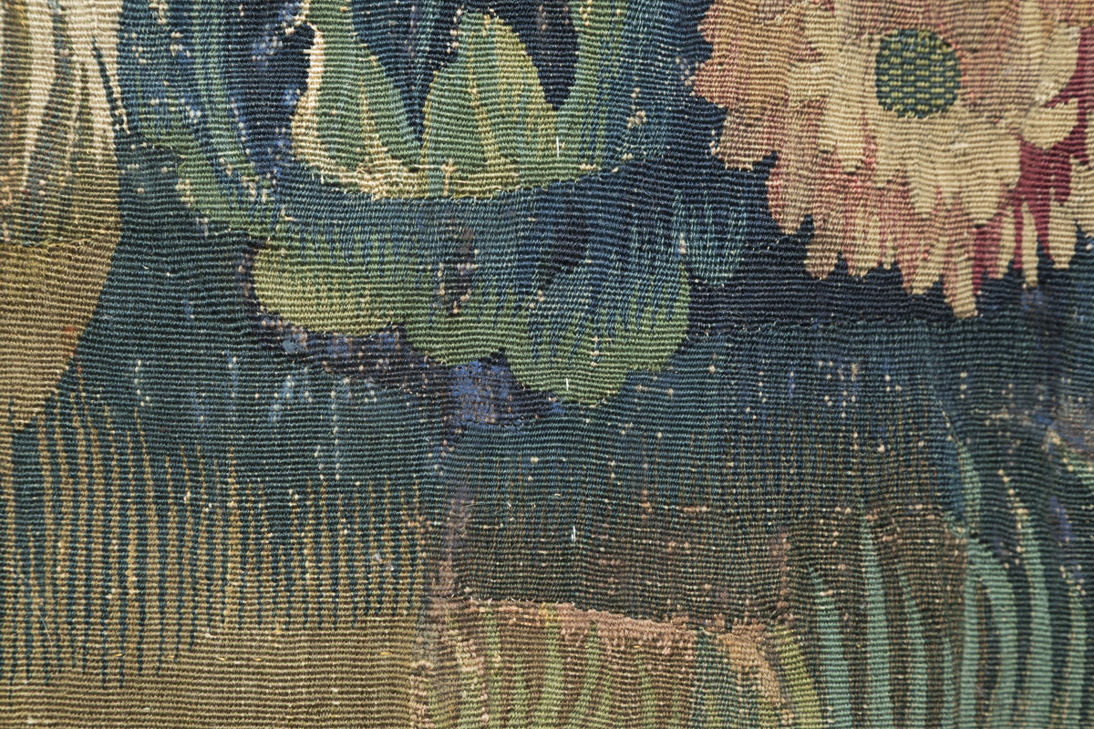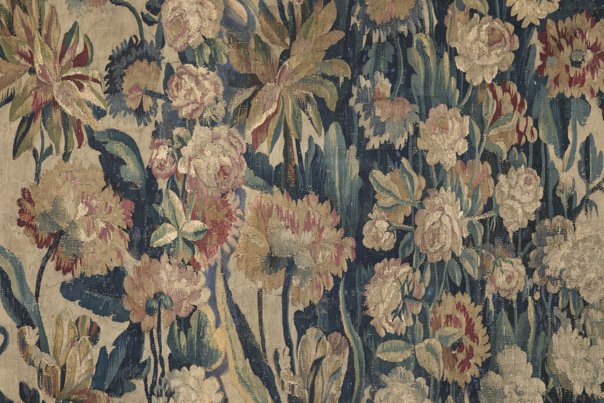 Pinks, reds, greens and blues on a dark brown ground. The tapestry is woven in wool and silk and reduced in size.