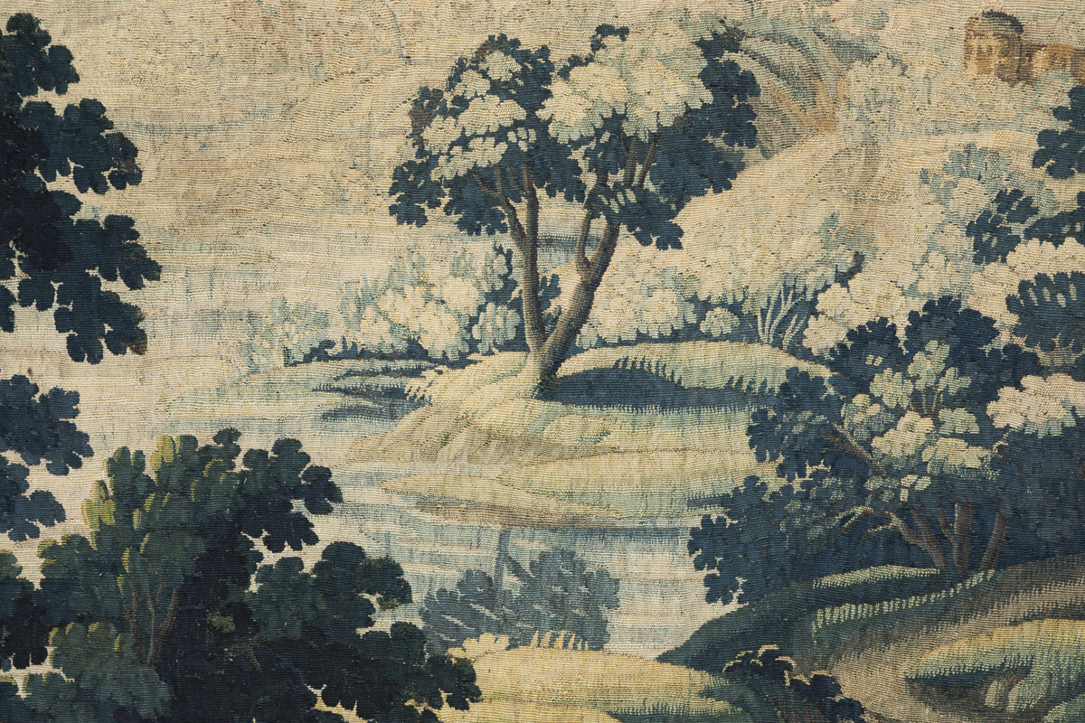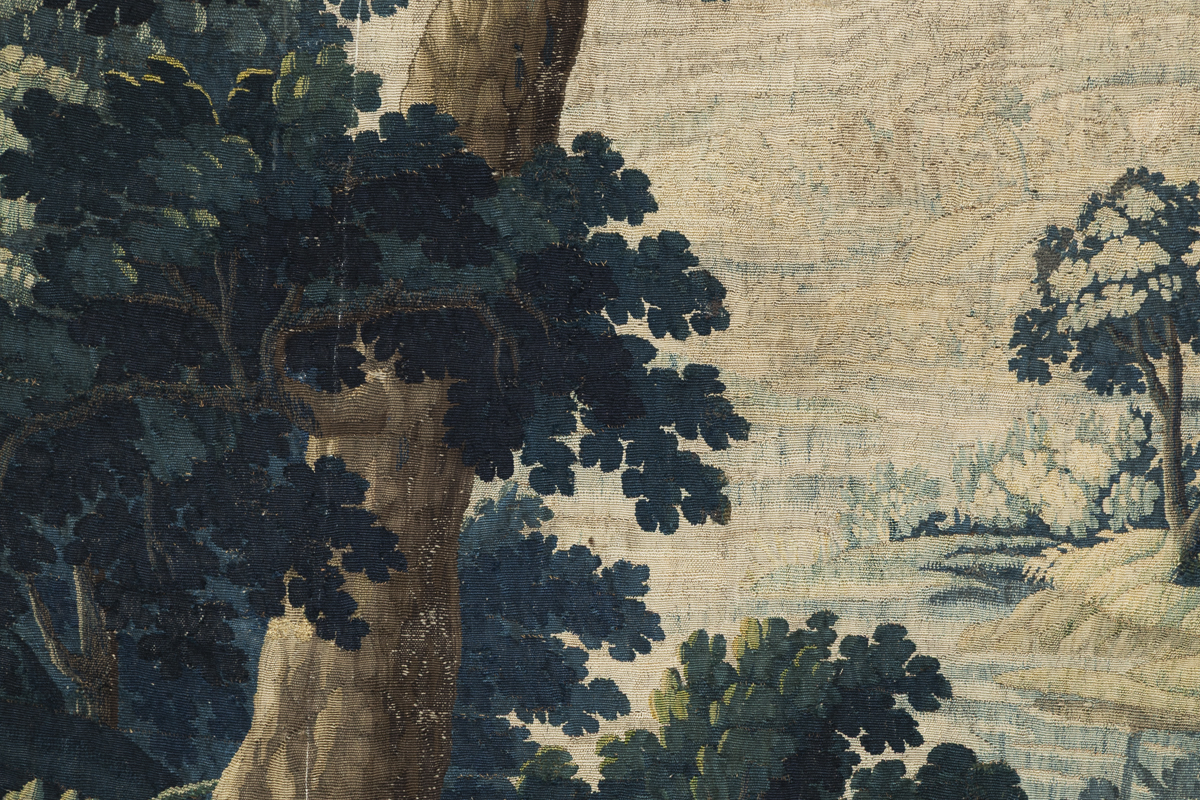Fine quality wool and silk verdure with trees and plants. A path winds through the trees from the centre to a body of water in the middle where trees are reflected.