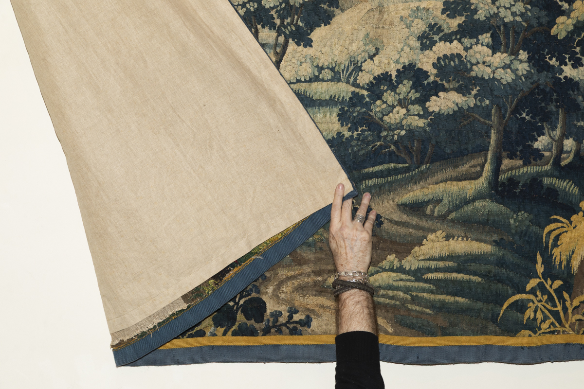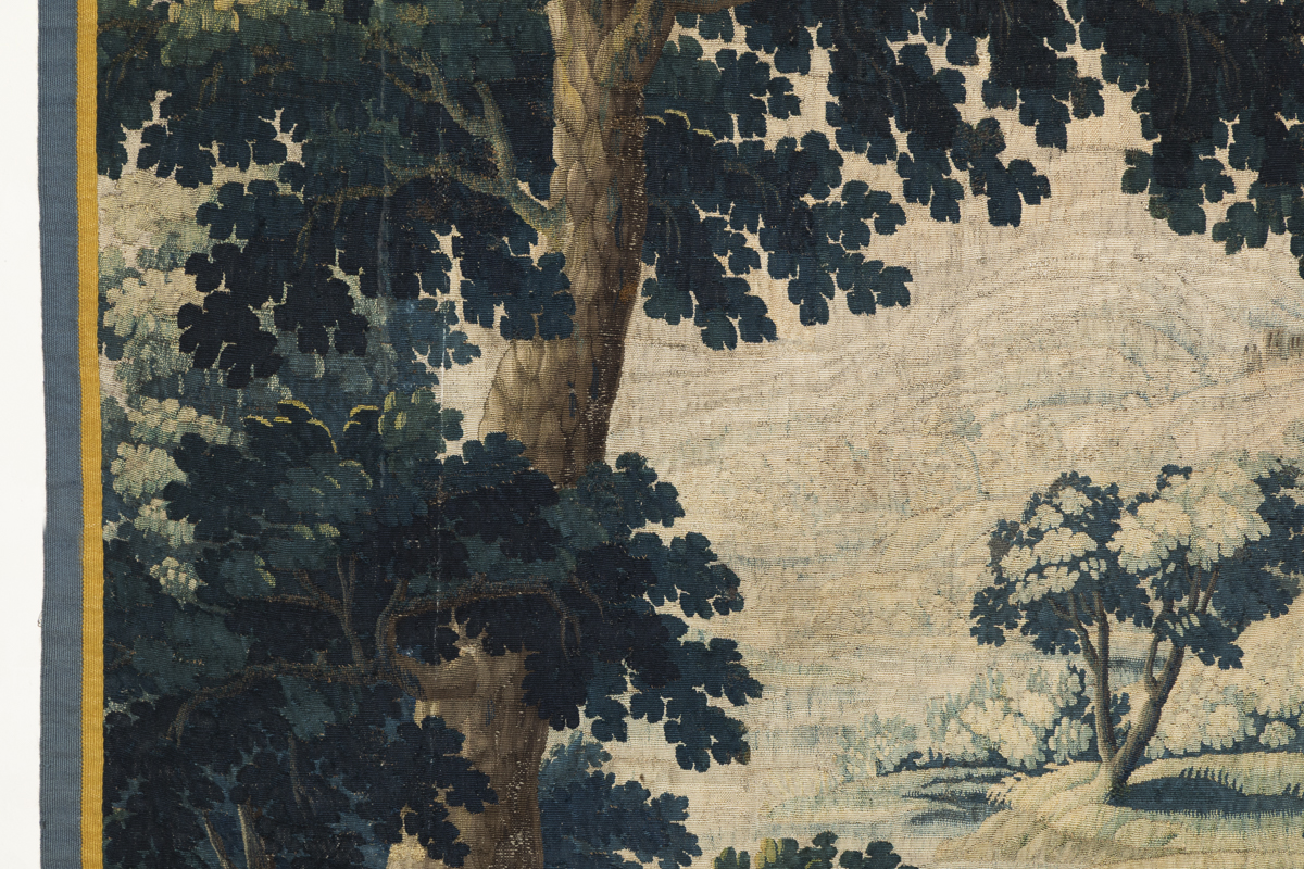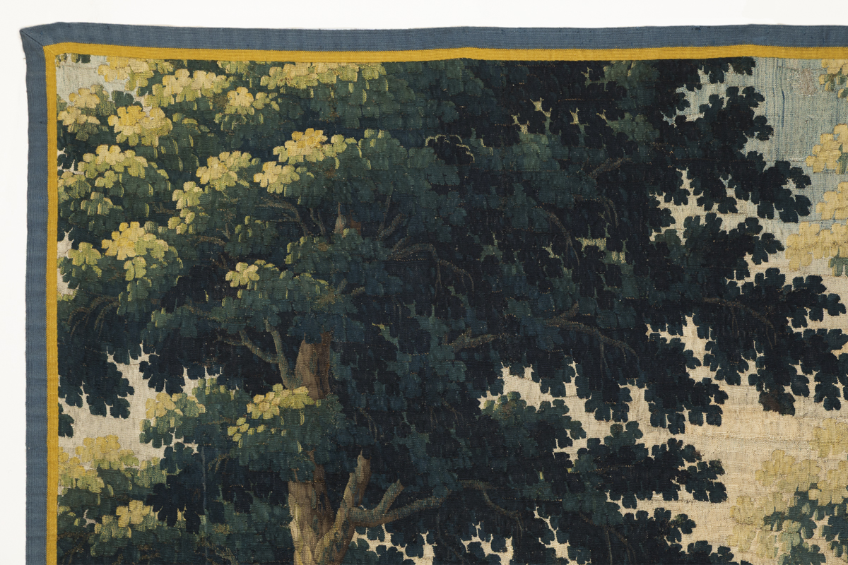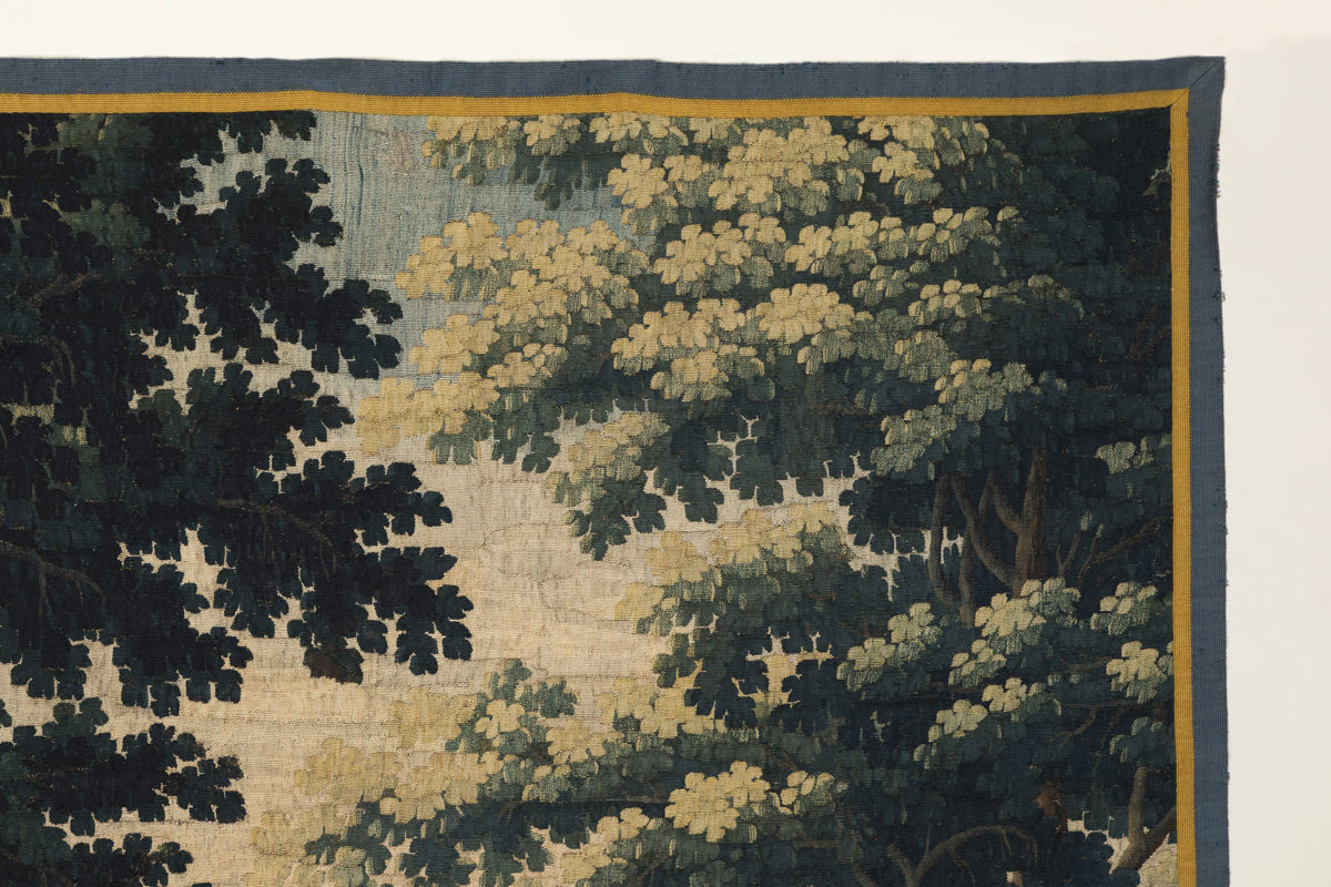 The tapestry is backed with linen and in good condition, the blue and yellow border is a later replacement.