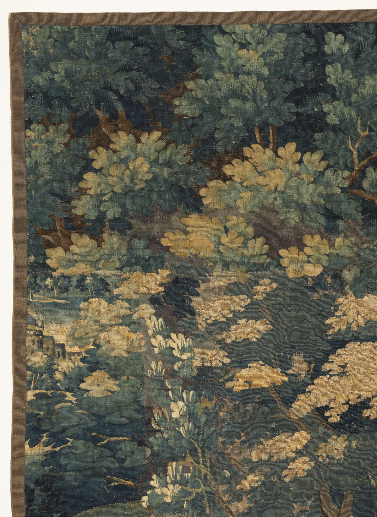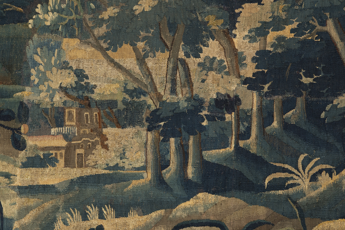 The tapestry is a fragment and has had some patching, visible in the photographs.